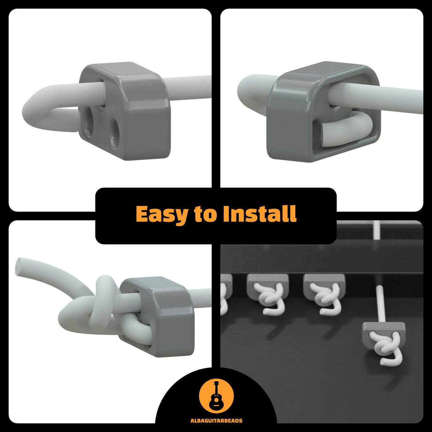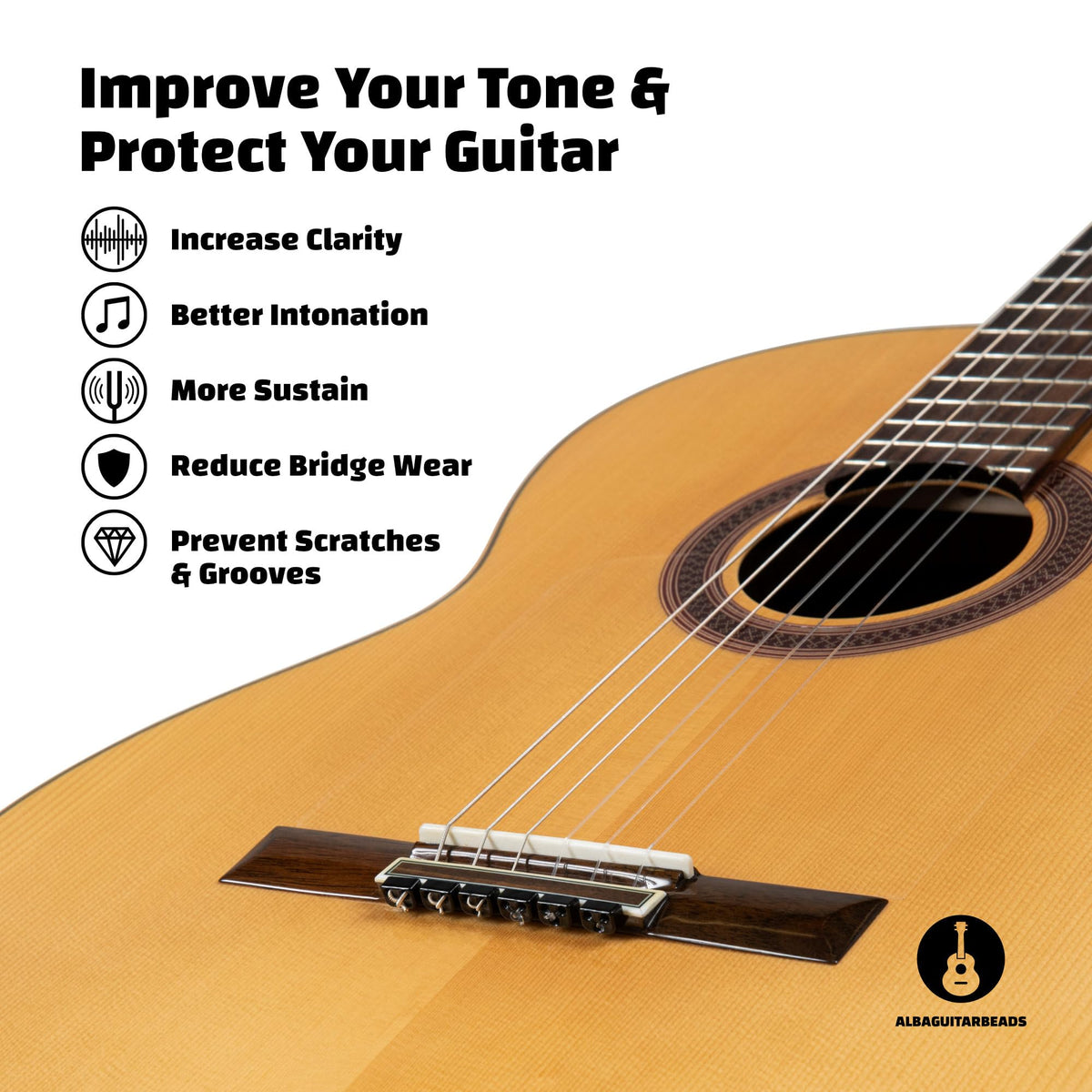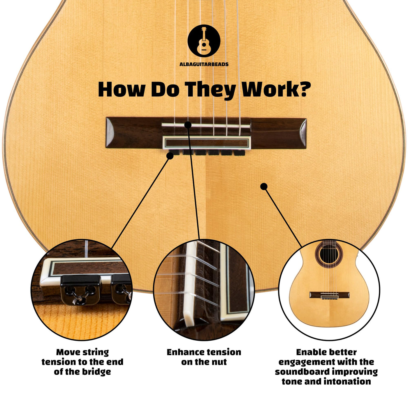 Guitar String Beads For Nylon Classical, Flamenco And Tenor Guitars, Ukuleles, And Other Nylon String Instruments. Great Design For Ultimate Performance And Fit On Your Bridge! Round Shaped, Without Hard Edges To Prevent Any Scratches On Your Bridge And For Utmost Comfort! Very Lightweight, Our Beads Aim To Improve Your Tone And Sound! Change Your Strings On Stage Within Minutes! Keep A Spare Set In Your Bag, Ready To Go Any Time! Our Beads Will Keep Your Guitar In Tune For Longer! Designed In Scotland, Uk! Every String Beads Set Includes: Easy To Follow Instructions Lightweight Round Design Set Of 6 Beads Our Round-Edged String Beads Are Made Of Nylon, And It Is A Very Durable Material. We Enclose A Set Of Instructions, A Diagram, And An Example Tie To Follow To Change Your Strings Within Minimum Time And Effort. In Short, You Will Create A Straightforward Standard Knot, The Same As If You Were Tying The String Around The Bridge When You Strung Your Guitar Without The Beads. Then, You Will Thread The String Through The Three Holes On The Bead/Tie And Tighten Up Your String With The Tuning Peg. This Technique Has Been Used For Years, If Not Centuries, In Spain, Southern Europe, Africa, Southern America, And Worldwide, With Any String Instruments. Compatible With All Types Of Bridges (Flamenco, Classical Etc.) And All Nylon Strings (High Tension Strings*), Gut Strings* And Carbon Strings* *Please Review The Enclosed Instructions And Our Instructions Page.
