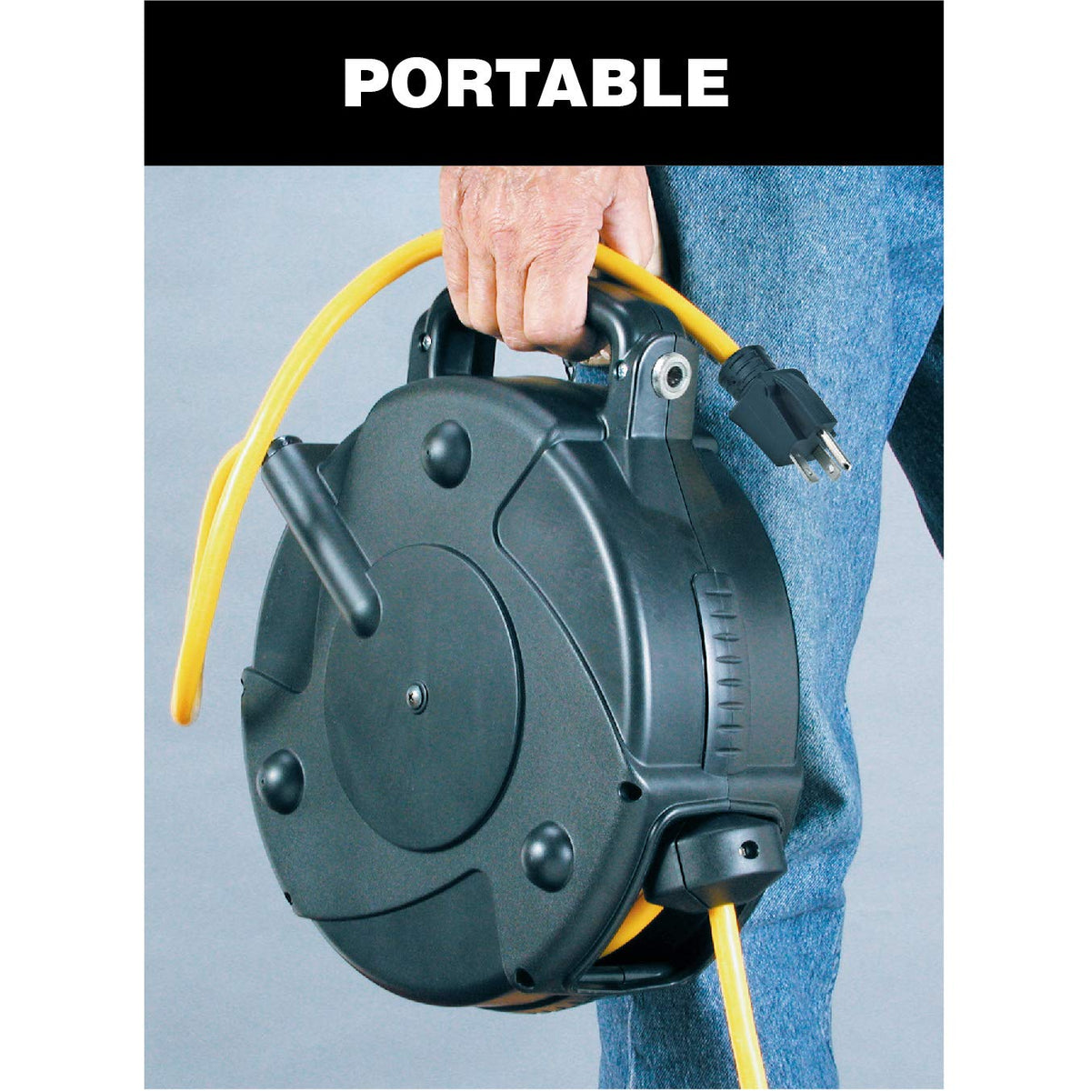 Industrial Retractable Extension Cord Reel W/ Tri-Tap And Circuit Breaker Product Description 40 Ft 12/3 Cord, Heavy-Duty Industrial Grade Thermos Plastic Reel Tri-Tap Power Block W/ 3 Grounded Outlets & Power On Indicator Light Resettable Circuit Breaker Built Into Tri-Tap Rollers For Smooth Cable Operation, Power On Indicator Lights, Convenient Carrying Handle, Mounting Hardware For Wall Or Ceiling Included, Color Box Reel Measurers Approx. 11 1/4 Inches X 4 3/4 Inches, Mail Pigtail Measures Approx. 36 Inches Weight Per Reel Approx. 17 Pounds Note: If Circuit Breaker Trips, Remove Overload And Wait Two Minutes Before Resetting Breaker By Pushing Reset Button. Additional Information Cord Type Cold Weather Sjtow Gauge 12/3 Cord Length 40 Ft. Total Max. Rating 1875 W, 15 A, 125 V Max. Power 1875 W Max. Current 15 A Max. Voltage 125 V No. Of Outlets 3 Nema 5-15R Upc Code Upc 0-40082-43071-5 Listings Culus