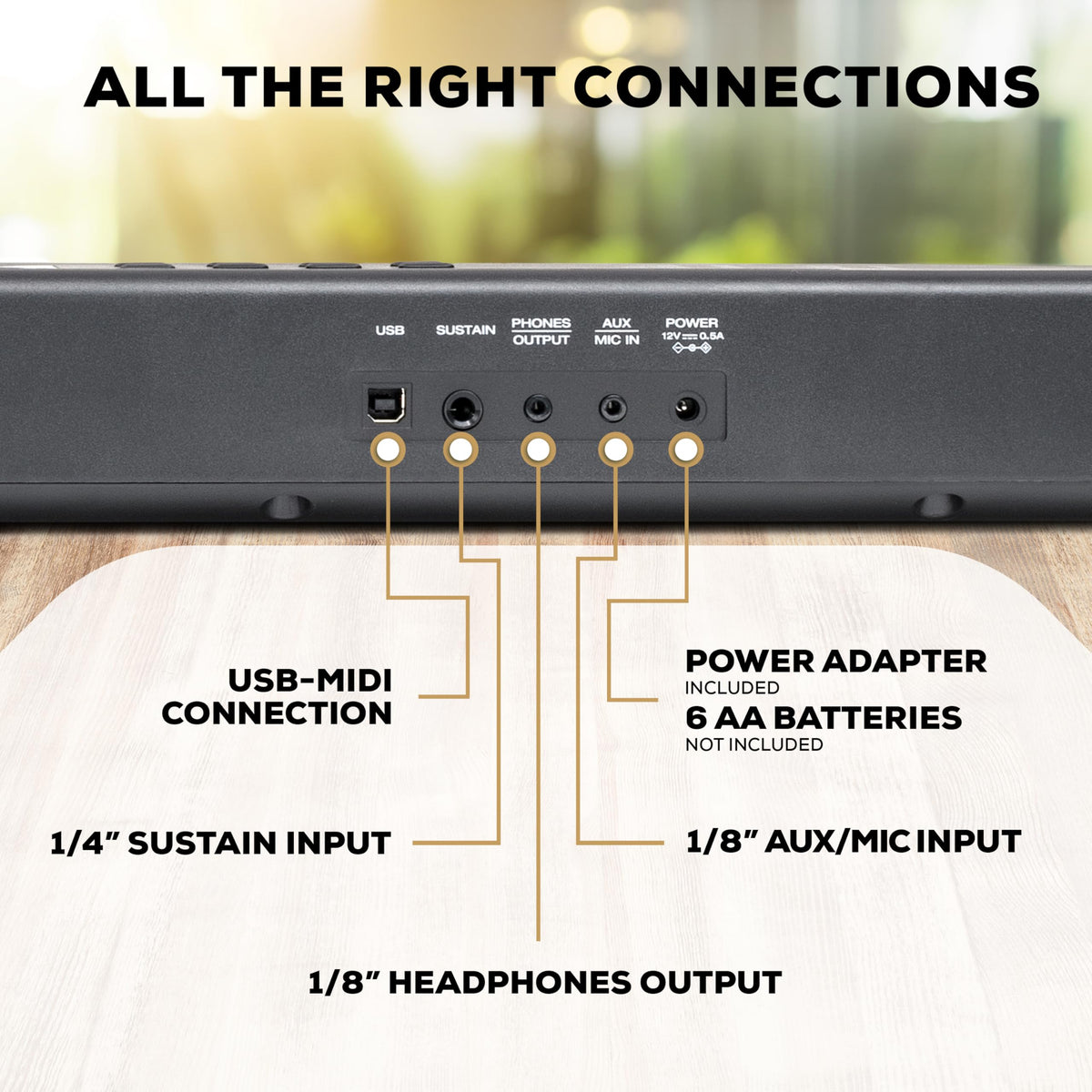The Recital Play Is A Portable Electronic Keyboard With Built-In Speakers That Delivers An Authentic And Inspiring Playing Experience, Specially Tailored Towards Beginner Piano Students Of All Ages. With An Incredibly Easy-To-Use Control Panel, A Massive Selection Of Sounds, And Convenient Features, The Music Keyboard Has 88 Full-Sized Keys With Adjustable Touch Response, Making It Excellent For Helping New Piano Students, Both Kids And Adults, Develop Their Finger Strength And Dexterity!The 88-Key Electronic Piano Keyboard Features 480 Realistic And Inspiring Built-In Sounds That Cover A Wide Variety Of Instrument Types-Acoustic And Electric Pianos, Organs, Strings, Brass, Woodwinds, Percussion, Mallets, Guitars, Synths, And Even Sound Effects! You Can Layer Two Of These Sounds Together In Layer Mode Or Split Two Sounds Across The Keyboard In Split Mode. You Can Also Easily Add And Adjust Reverb Fx Feature To Add Additional Realism To Your Sound.Best Of All, The Recital Play Includes All The Accessories You Need To Start Playing Today: X Stand With Adjustable Height Setting, Gig-Bag Style Carry Case, Music Rest For Holding Sheet Music Or A Mobile Device, Sustain Pedal, Pair Of Headphones, And Power Adaptor.