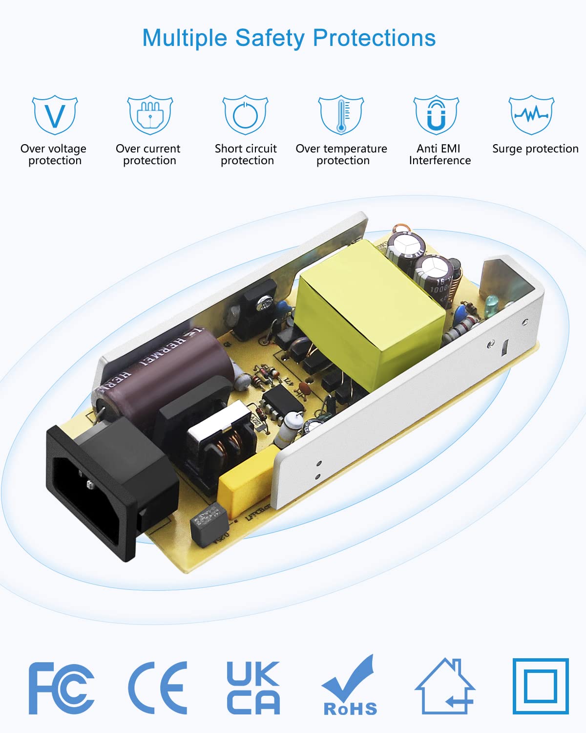 Q: What safety features are included in this power supply?A: This power supply includes multiple safety features such as automatic overload cut-off, overvoltage protection, thermal cut-off, and short circuit protection. These features help ensure safe and reliable operation, protecting your devices from potential damage.