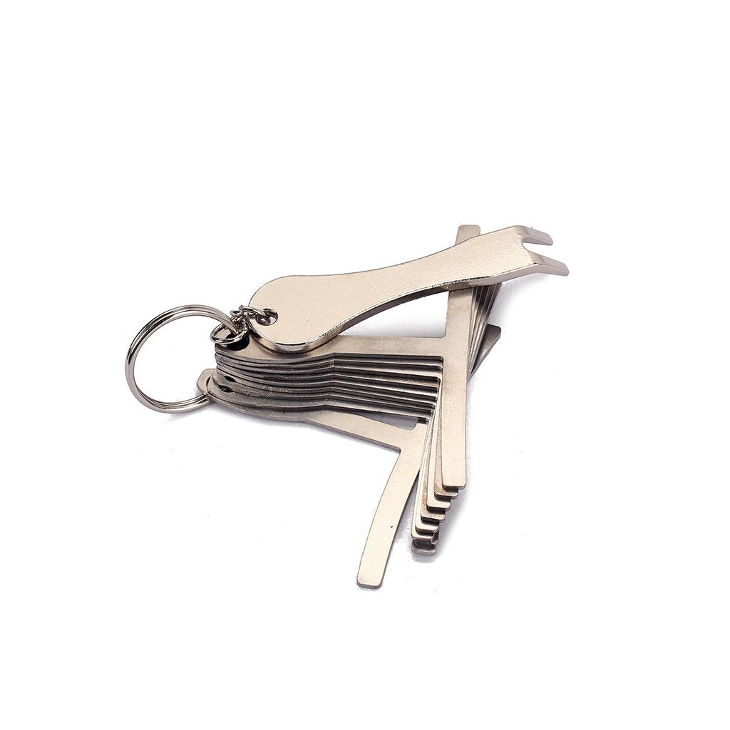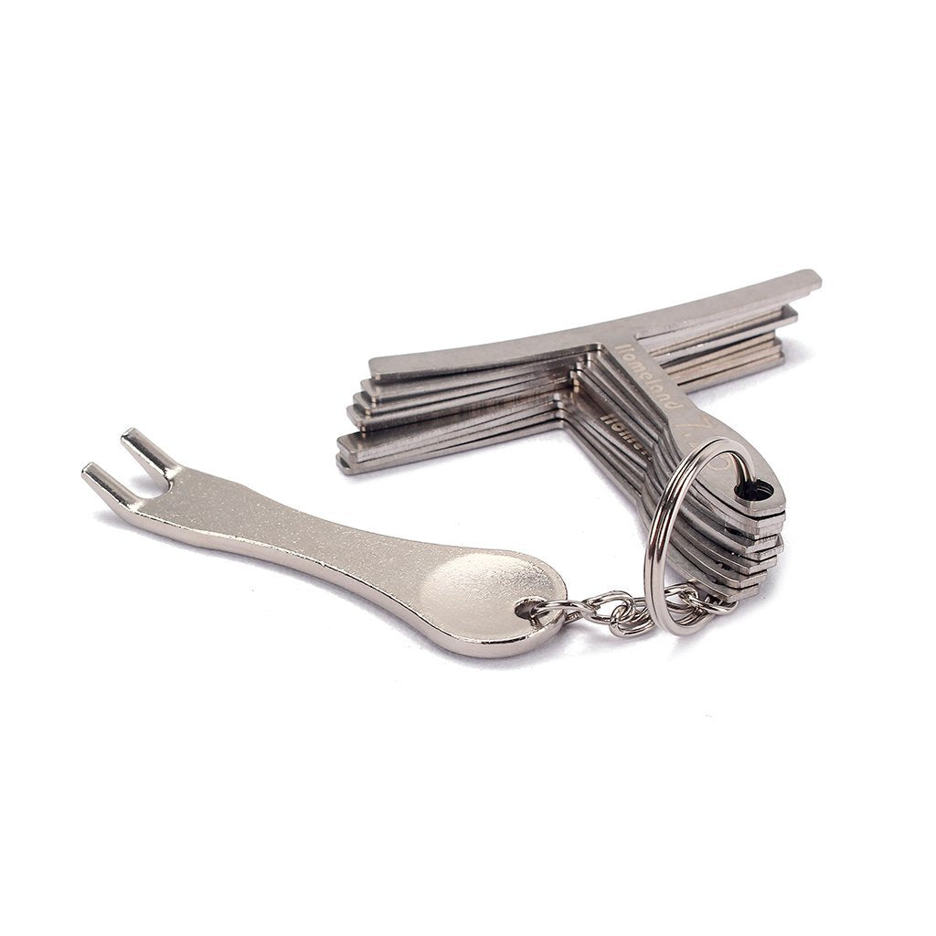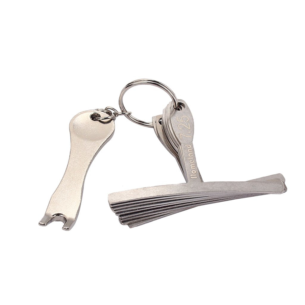 Description:Stainless Steel Understring Radius Gauge+Pin Puller Keychain For Guitar Bass Luthier Tool.9Pcs Stainless Steel Radius Gauges, Durable And No Rough Edges To Scratch The Fretboard.Radius Gauges Comes In 9 Sizes: 7.25'' 9.5'' 10'' 12'' 14'' 15'' 16'' 17'' 20'' .A Great Tool For Helping You Setup Your Guitar Bridge Saddle To Match The Fretboard Radius.Suitable For Acoustic Guitars, Electric Guitars, Or Bass Bridge Saddles Setup.Size Chart:Size: Approx. 70X52.5X1.25Mm/2.76X2.07X0.05Inchpackage Includes:9 Pieces Understring Radius Gauge1 Piece Pin Puller Keychain