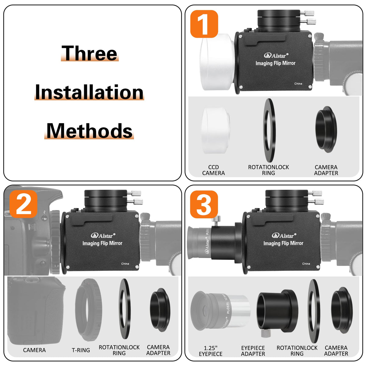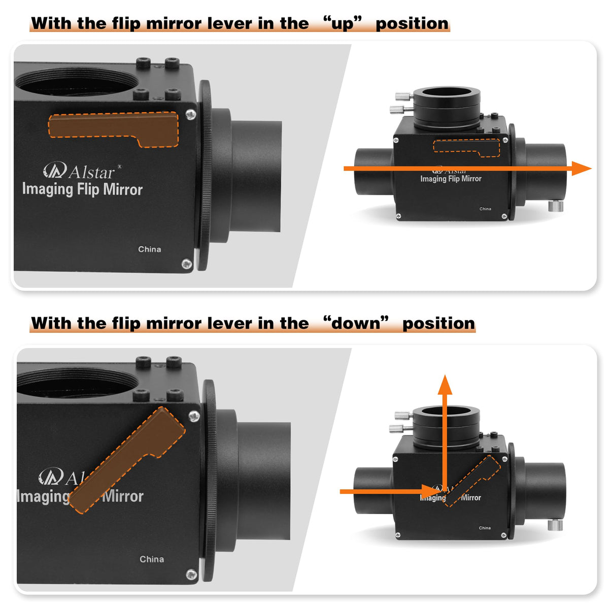 As Easy As Flipping A Switch, The Imaging Flip Mirror Enables The Astrophotographer To Find, Center, And Focus A Target Object Visually With A 1.25 Telescope Eyepiece, Then Photograph It With A Charged Coupled Device (Ccd) Camera. All Without Swapping Out Any Equipment. Its A Real Time Saver, Making The Normally Tedious Task Of Focusing With The Ccd Camera Alone Quicker And Easier.Rather Than Having To Take Numerous Astrophotos To Locate And Focus Your Target, The 1.25 Alstar Astrophotography Flip Mirror Lets You Do Those Things Visually With A Telescope Eyepiece. An Internal Mirror Deflects The Incoming Light 90 Degrees Up Into The Eyepiece. A Helical Fine Focus Mechanism On The Telescope Eyepiece Holder Lets You Set The Eyepiece Focus To Be Parfocal With The Camera. Then, Once Youve Focused The Celestial Object In The Eyepiece, A Flip Of The Side Lever Drops The Mirror To Allow The Light To Enter The Camera, Rendering A Sharp, Focused Ccd Image.The Astro-Imaging Flip Mirror Was Designed Specifically For Use With Starshoot Deep Space Imagers And Similarly Sized Ccd Cameras, For Which It Provides Full Sensor Illumination. Male T-Threads On The Units Metal Housing Allow Direct Attachment Of The Ccd Camera Body. The Housing Itself Connects To A Telescopes 1.25 Focuser Or Adapter Via The Nosepiece, Which Alternatively Can Be Removed To Expose T-Threads For Direct Coupling. The Nosepiece Is Threaded For 1.25 Filters. As Convenient As It Is For Ccd Imaging, The Alstar Astrophotography Flip Mirror Also Lets You Enjoy Visual Observation When You Want To Take A Brief Break From Shooting Pictures. Maybe You Want To Catch An Eyeful Of That Bright Planet Before It Sets. You Can Do So Without Having To Dismantle Your Camera Setup! Why Not Streamline Your Astrophotography Routine And Take An Occasional Break To Enjoy The Views While Youre At It? Get The 1.25 Alstar Astrophotography Flip Mirror Today!
