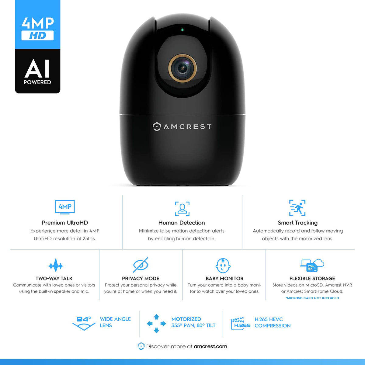 Amcrest Model: Ash41-B Camera Features: Amazing Real-Time True-Hd 4-Megapixel (2560X1440P) @ 25Fps Extra-Wide 94 Viewing Angle Night Vision Up To 33 Feet With Built-In Ir Leds And 1/2.7 4Mp Image Sensor The Ash41 Features Two-Way Audio So You Can Talk And Listen 355 Pan, 80 Tilt And 16X Intelligent Digital Zoom 3.6Mm Lens With Ir Led Night Vision Up To 33 Feet This Camera Needs To Be Connected To A Power Source In Order For It To Be Powered This Is An Amcrest 2.4Ghz Wifi Indoor Camera And Does Not Support 5Ghz Network Microsd Storage Up To 256Gb (Class 10 Or Higher, Not Included) Baby Monitor Mode, Smart Tracking And Built In Human Detection Algorithm To Reduce False Motion Alarms And Prevent Unnecessary Recordingsdual H.265/H.264 Video Compression Technology Operating Temperature: 14F~113F This Product May Contain Components Which Are Not Ndaa Compliant Dimensions (L*W*H): 4.18 X 3.05 X 3.05 Inches Weight: 0.46 Lbs Package Includes: 1 X Smarhome 4-Megapixel Wifi Pan / Tilt Camera Black (Ash41-B) 1 X Microusb 5V Power Adapter 1-Year Warranty From Amcrest And Lifetime Technical Support