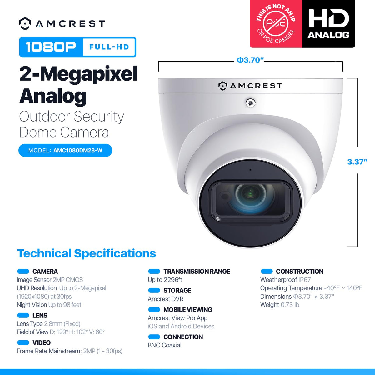 Amcrest Model: Amc1080Dm28-W Camera Features: 1/2.7 2Megapixel Cmos 2-Megapixels (1920X1080P) @30Fps 1 Ir Lights For 98Ft Nightvision 2.8Mm Focal Length 129 Fov Ip67 Weatherproof Quadbrid 4-In1 Hd-Cvi / Tvi / Ahd / Analog Dori Distance: Detect: 135.83Ft Observe: 42.13Ft Recognize: 27.23Ft Identify: 13.45Ft Cvi: 1080P @30Fps; Ahd: 1080P @30Fps; Tvi: 1080P @30Fps; Cvbs: 960H Long Distance Transmit Range 2624 Feet Analog Cameras Require A Dvr To Operate. A Dvr Is Required, But Not Included And Is Sold Separately. Camera Power Supply And Coaxial Video Cables Are Not Included But Are Required And Sold Separately Operating Conditions: -40F ~ 140F Dimensions: 3.7 X 3.7 X 3.37 Inches Weight: 0.73 Lbs Package Includes: 1 X 1080P Quadbrid Hd-Cvi/Tvi/Ahd/Analog Dome Camera White (Amc1080Dm28-W)