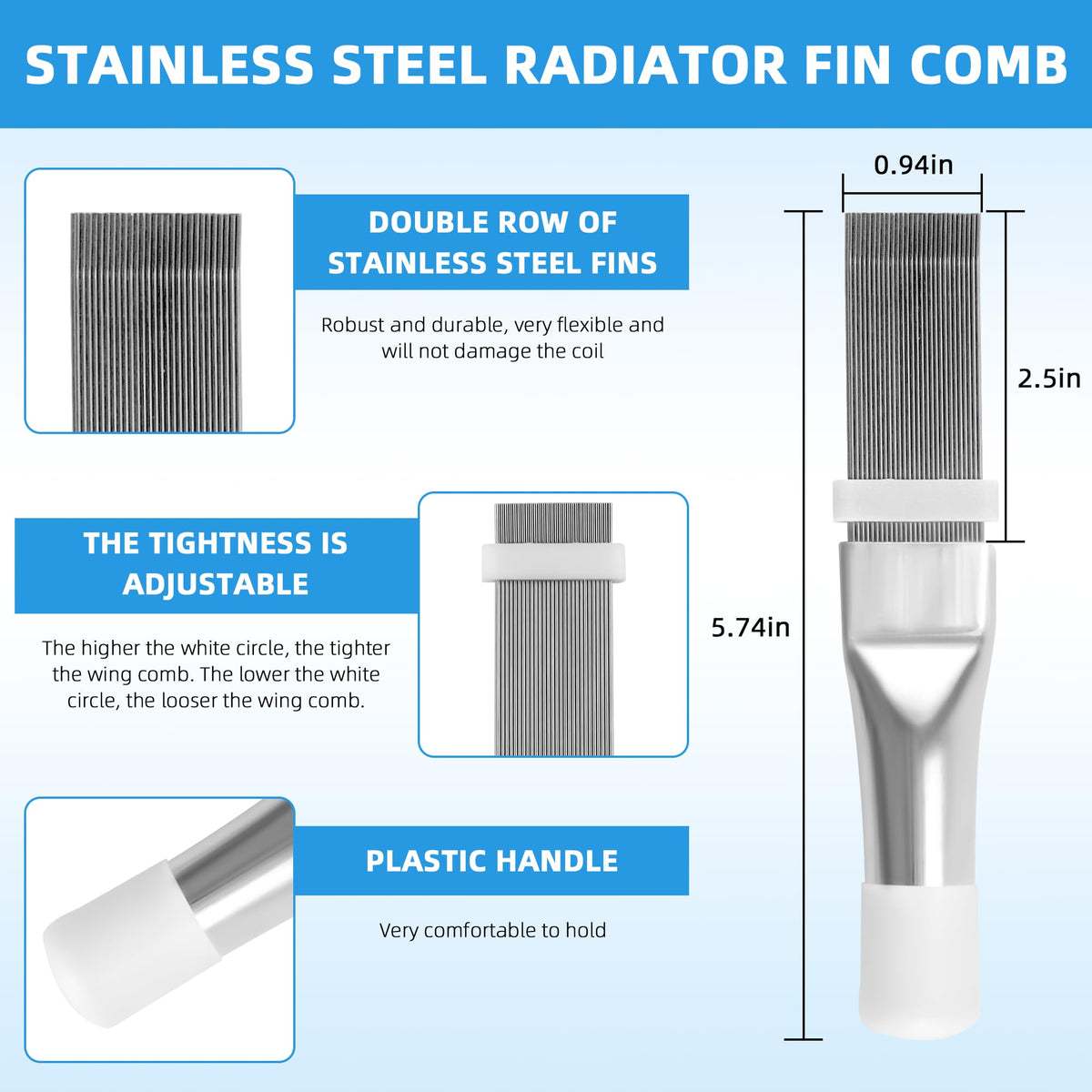 Q: What sizes and types of combs are included in the set?A: The set includes a FCR6 ring fin comb, a 6-in-1 plastic fin comb, and a stainless steel radiator fin comb, each designed to address different fin sizes and types for comprehensive cleaning and maintenance.