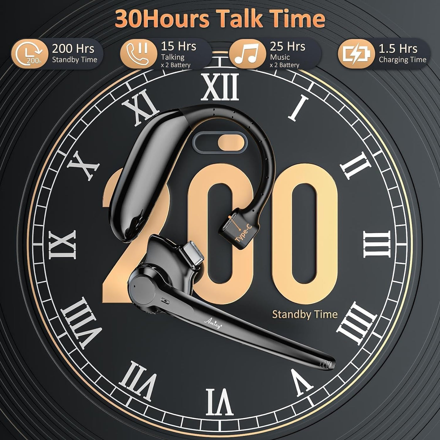 Q: What is the battery life of the AMINY Wireless Bluetooth Headset?A: The AMINY Wireless Bluetooth Headset offers an impressive 30 hours of talk time, with each of its two batteries providing up to 15 hours of use. Additionally, the headset has a 200 hours ultra-long standby time.
