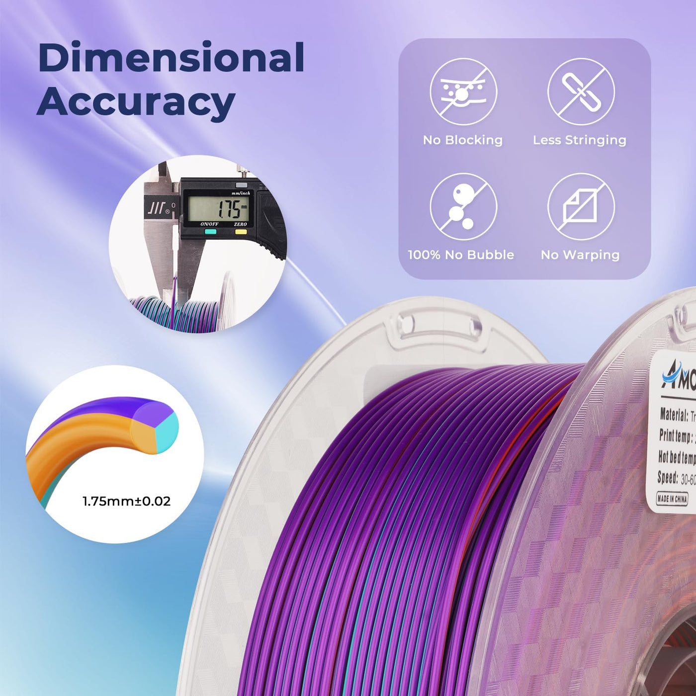Q: Can I achieve multi-color prints using AMOLEN Silk PLA filament?A: Yes, AMOLEN Silk PLA filament features a tri-color combination of Purple, Blue Green, and Burnt Orange, allowing you to create beautiful multi-color prints without needing to switch spools.