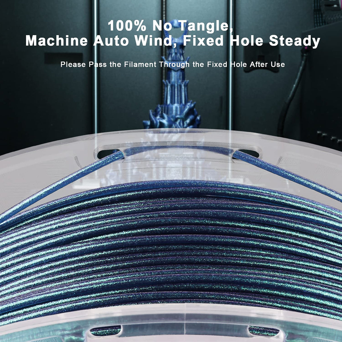 Q: How does the color change effect work with this filament?A: The AMOLEN PLA Filament features a shiny color change effect that shifts from purple to blue, adding a stunning visual appeal to your 3D printed items as they catch the light.