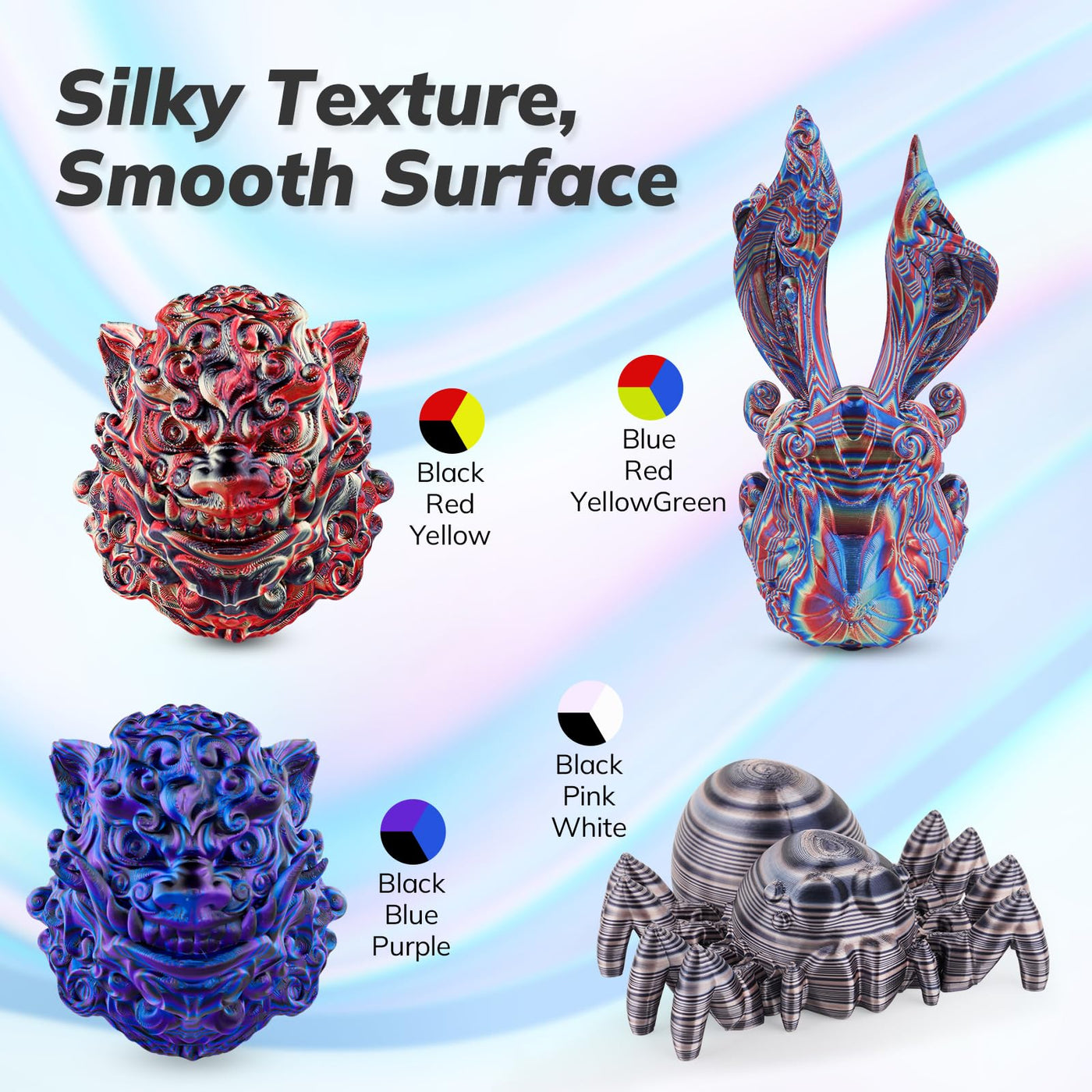 Amolen Silk Pla 3D Printer Filament, Shiny Multicolor Rainbow Pla Filament 1.75Mm, Fast Color Change Pla 3D Printing Filament For Most Fdm 3D Printer, 1Kg X 4 Spools Specifications: Material: Silk Pla 1.75Mm Color: Black White/Blue Red Green/Black Red Green/Black Blue Purple Weight: 4Kg Diameter: 1.75Mm Dimensional Accuracy: +/- 0.02 Mm Printing Temperature 210-240? Printing Bed 30-65? Note: Keep The Silk Pla Filament As Vertical As Possible Without Twisting It. Because Of Shooting Light Or Display Resolution, There Is Little Color Shading Between The Pictures And Filaments. There Is A Little Difference Between Different Batches, So It Is Recommended To Buy Enough Filament At One Time.