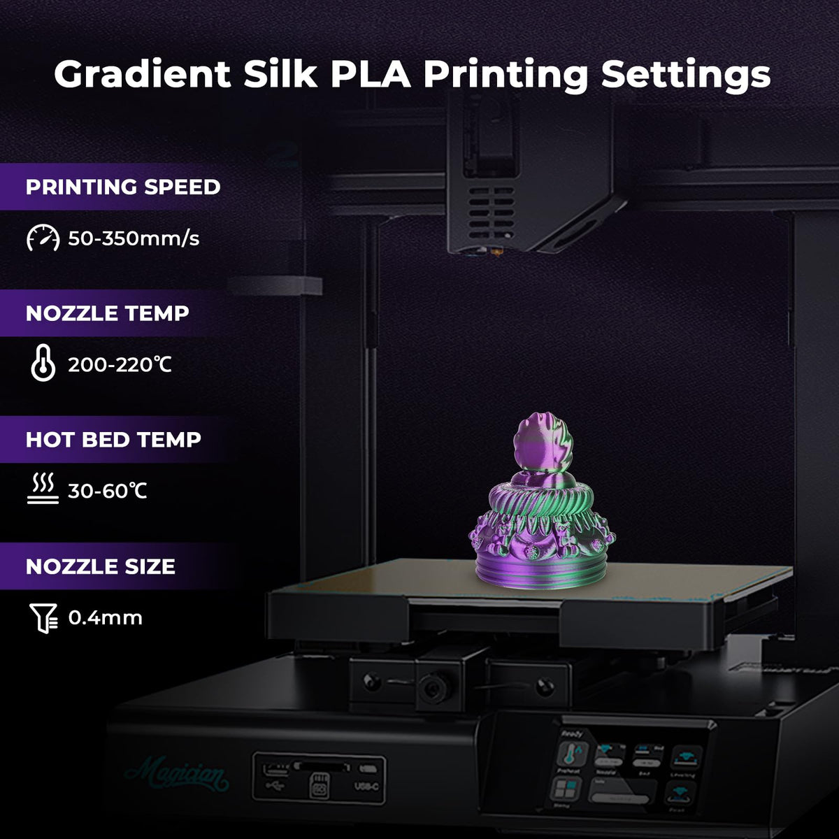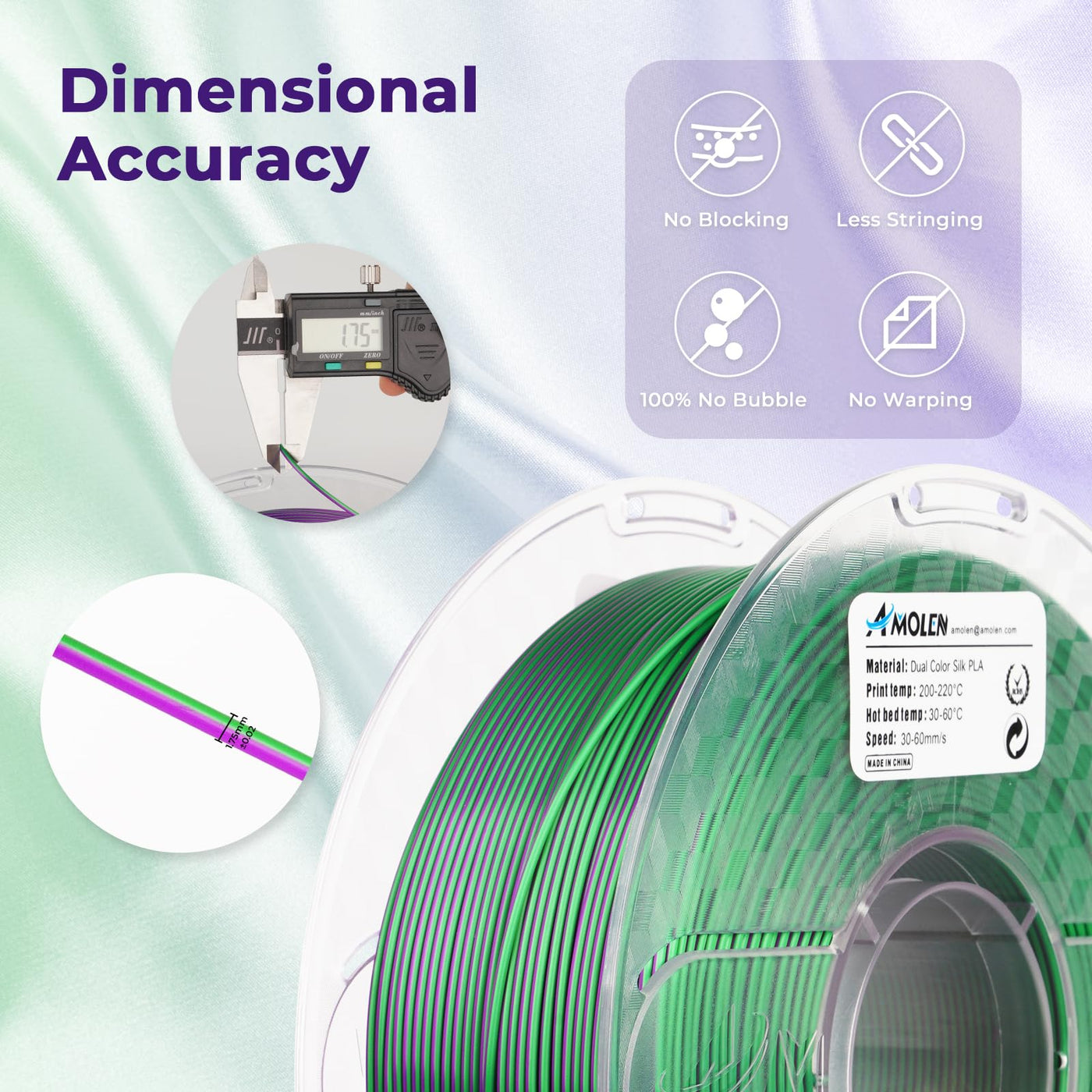 Q: How does the dual color feature work in AMOLEN Silk PLA?A: The dual color feature of AMOLEN Silk PLA allows you to create prints that exhibit different colors on each side, thanks to its unique shiny purple and green combination. This makes it perfect for artistic projects and eye-catching designs.
