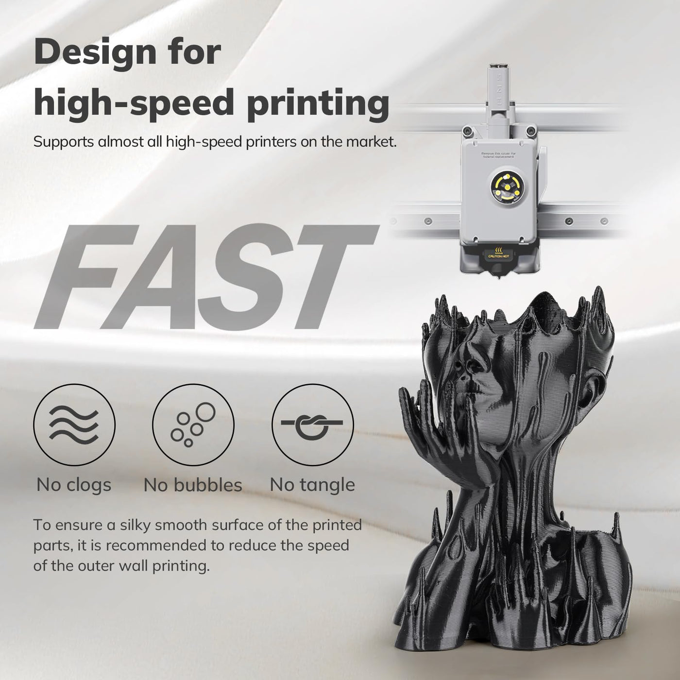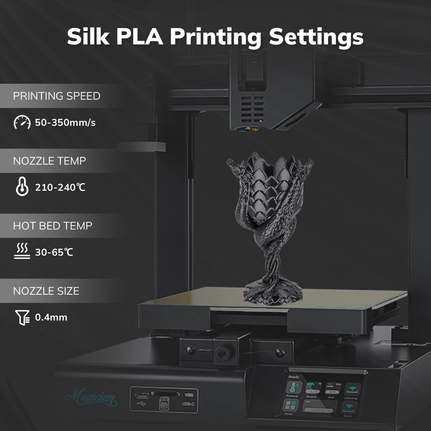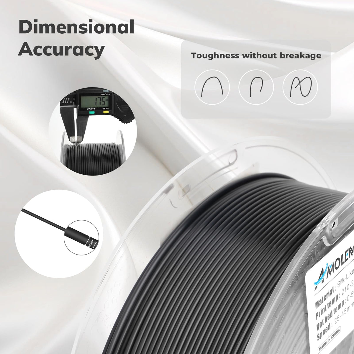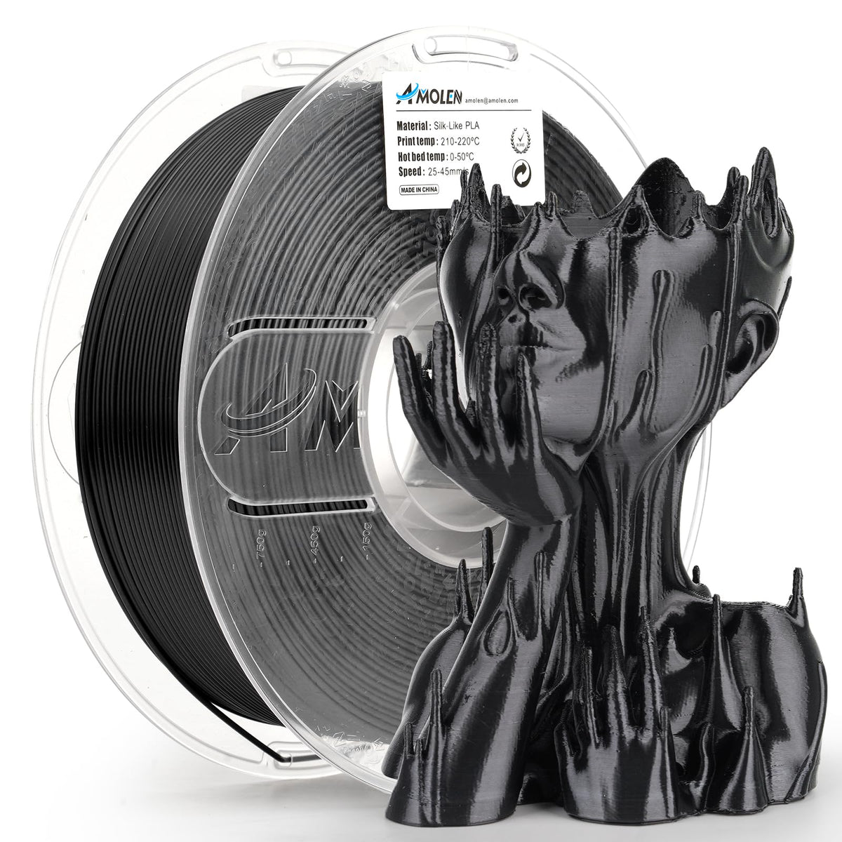 Q: What is AMOLEN Silk PLA filament made of?A: AMOLEN Silk PLA filament is made from high-quality Polylactic Acid (PLA), which is a biodegradable thermoplastic derived from renewable resources like corn starch or sugarcane, ensuring an eco-friendly option for 3D printing.