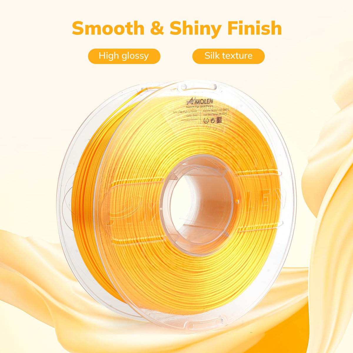 Q: What is AMOLEN Silk PLA filament made of?A: AMOLEN Silk PLA filament is made from high-quality Polylactic Acid (PLA), specifically designed to provide a smooth and glossy finish in your 3D printed models.