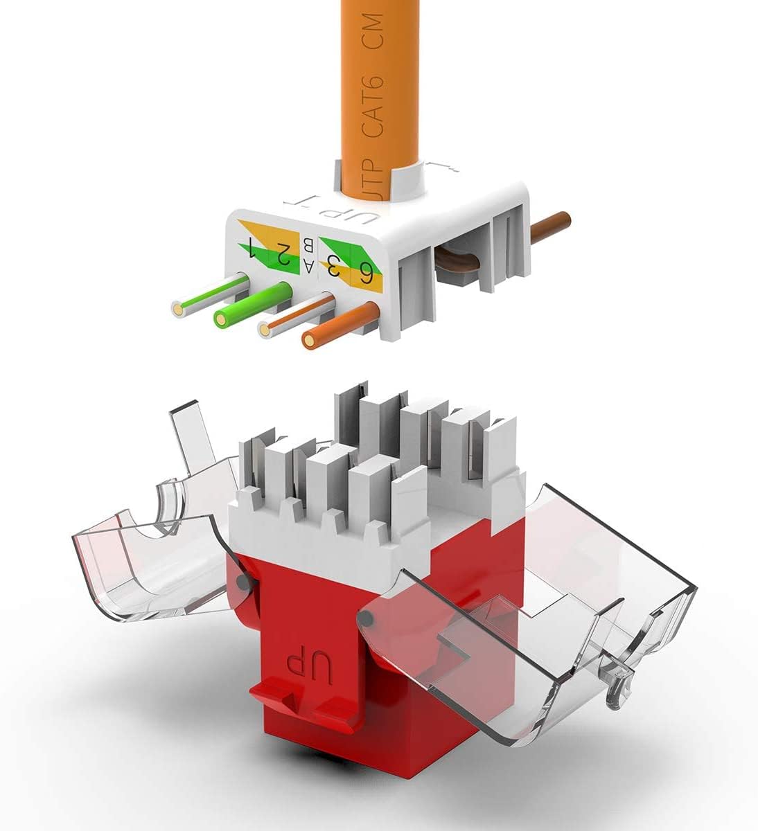 Self-Terminating, No Tool Required: This Toolless Utp Cat6 Keystone Jack Is A Female Rj45 Connector For Networking;The Cable Conductors Can Be Terminated By A 180 Degree Snap-Fit Cap Being Pressed Into Place, Designed To Smoothly Snap Into Most Of The Standard Keystone Applications | Housing Materials: Made With 50? Gold Plated Connector And Full Copper Conductor, Prevent The Corrosion Over Time; Abs Case For Fire Resistance; Features A Dust-Proof Shutter To Ensure Signal Transmission | Features: Cat 6 Performance To Future-Proof Your Network|Backwards Compatible To 10/100/1000 Mbps Ethernet Cat5 Cat5E Cat6. Complies With The Ansi/Tia/Eia 568-C.2 Standard; Labeled For T568A And T568B Wiring Scheme Next To Wire Clips; 110 Or Krone Type Termination Are Both Supportive; It Accepts 22 To 26 Awg Solid Ethernet Patch Cords | Applications: The Jack Is Compatible With A Wide Range Of Patch Panels, Surface Mount Boxes, Or Wall Plates (Face Plates). It Is Quite Versatile That Can Be Mounted With Different Type Of Keystones On A Same Plate | Packaging: 12 Pcs Cat6 Keystone Module Connector Per Bag
