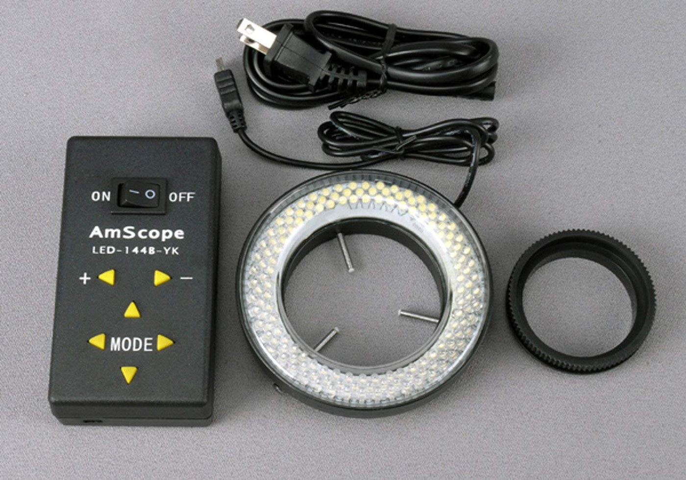 The Amscope Led-144A Stereo Microscope Illumination System Has A 144-Bulb Led Ring Light With Four Separate Zones To Independently Control Light Intensity And Direction. The Ring Light Provides Bright, Cool Light For Working With Temperature-Sensitive Or Live Specimens, And Shadow-Free Illumination. A Rheostat Controls The Amount Of Light Emanating From The Lamp. Power And Adjustment Controls Are Located On A Control Box To Speed Adjustments. The Ring Has A 2-1/2 (64Mm) Inside Diameter And A 4 (100Mm) Outside Diameter. The Light Includes An Adapter Ring For Mounting On A Stereo Microscope Head. It Has A 100,000-Hour Life Span And A 110V-240V Auto-Detecting Power Supply.Microscopes Are Instruments Used To Enhance The Resolution Of An Object Or Image. Types Include Compound, Stereo, Or Digital. Compound Microscopes Use A Compound Optical System With An Objective Lens And An Eyepiece. Stereo Microscopes Show Object Depth In A Three-Dimensional Image. Digital Microscopes Are Used To Display An Image On A Monitor, Rather Than Looking Through A Lens. Microscopes Can Have Monocular (One), Binocular (Two), Or Trinocular (Three) Eyepieces, With Varying Magnification Abilities. Magnification Ability Refers To The Size Of An Image. Resolution, Also Known As Resolvant Power, Refers To The Clarity Of The Image. The Interaction Between Field Of View (Fov), Numerical Aperture (Na), And Working Distance (Wd) Determines Resolution. Microscopes Can Control Magnification Through A Fixed Focus, Or Through A Range Of Adjustments. They Can Also Utilize Led, Fluorescent, And Mirror Light Sources To Help Control Viewing Capabilities. Microscopes Are Widely Used In Education, Lab Research, Biology, Metallurgy, Engineering, Chemistry, Manufacturing, And In The Medical, Forensic Science, And Veterinary Industries.United Scope Manufactures Microscopy Equipment And Accessories Under The Brand Name Amscope. The Company, Founded In 1996, Is Headquartered In Irvine, Ca. Whats In The Box? Led Ring Light Control Box Mounting Ring Power Cord