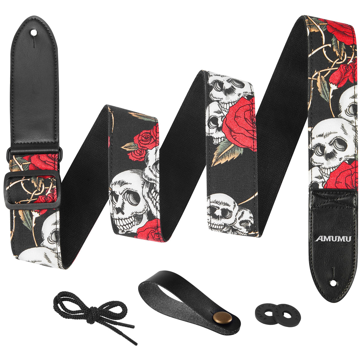 Amumu Guitar Strap - 2 Rose Skull Pattern For Acoustic, Electric And Bass Guitars, Adjustable 36 - 63
