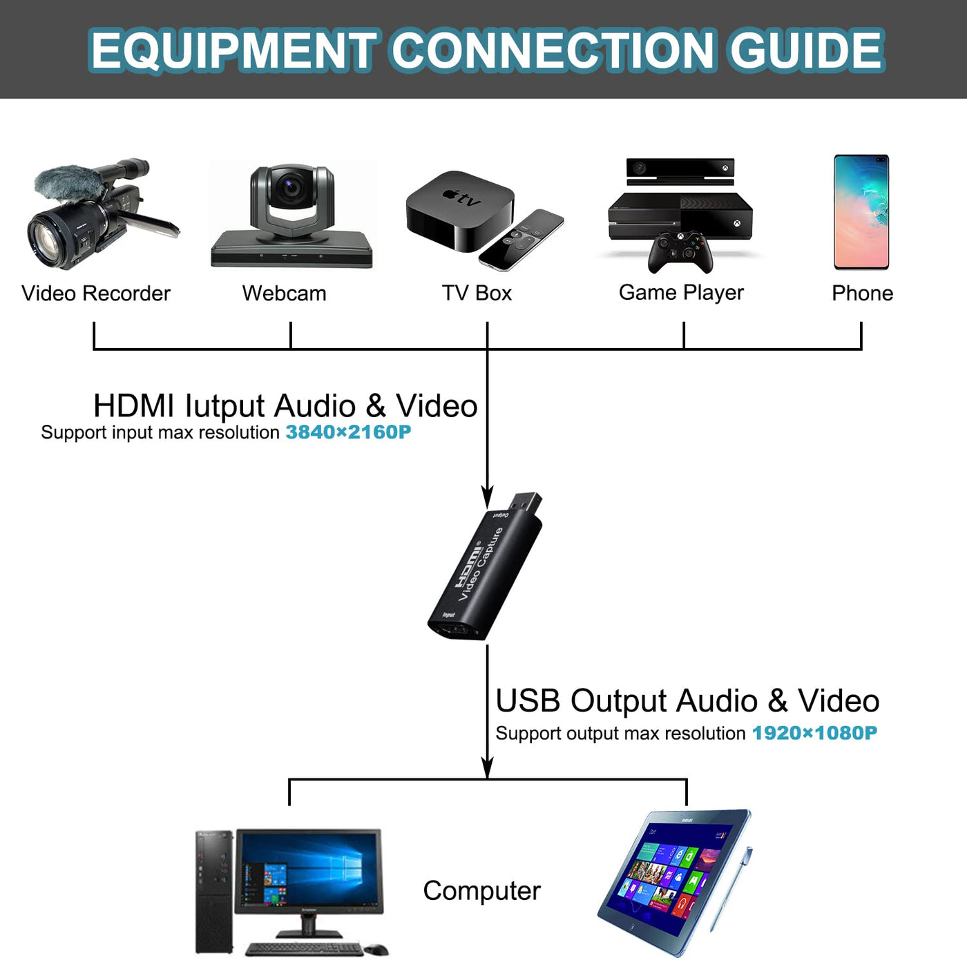 Amzhrly Upgraded 1080P Video Capture Card Can Collect Hdmi Audio And Video, It Uses Multi-Layer Circuit Protection For Better Anti-Static And Heat Dissipation. Hdmi Audio And Video Signals Can Be Transmitted To The Computer And Smartphone For Preview And Storage, Now You Can Enjoy Stunning Real-Time Video Streaming. It Support Hdmi Input 3840X2160P And Usb Output (Capture) 1920X1080P Video And Stereo Sound. Connect (Slr Camera, Camcorder Or Motion Camera) To (Windows, Macos, Android Or Linux) To Easily Get Real-Time Streaming Media From Software Such As Obs Studio, Zoom, Potplayer, Twitch, Youtube, And Vlc. No Driver Or External Power Supply, Suitable For High-Definition Acquisition, Teaching Recoding, Gaming, Medical Imaging, Live Streaming, Broadcasting Live, Etc. Notice: Try Not To Use Hub, Because Some Cheap Hubs Have Poor Compatibility. Computer Hardware Configuration Requirements: Cpu: Pc I5-3400 Or Above; Nb I7-3537U 2.0Ghz Or Above Graphics Card: Pc Nvidia Gt630 Or Above;Nc Nvidia Gt735M Or Above Run Memory: 4G Ram Features: Hdmi Input Resolution 3840 2160@60Fps Usb Output Resolution 1920 1080@60Fps Video Output Format: Yuv/Jpeg Support Video Format: 8/10/12Bit Deep Color; Audio Format: L-Pcm Support Most Acquisition Software, Such As Vlc / Obs / Amcap, Etc Support Windows / Android / Macos Conform To Usb Video And Uvc Standard; Usb Audio Uac Standard Max Working Current: 0.4A/5V Dc Dimension (L * W * H): 64 * 28 * 13 (Mm) Without External Power Supply, Compact And Portable. Size 64X28X13(Mm)= 2.5X1.1X0.5(Inch) Weight 21.4G Package Including: Audio Video Capture Cards 1Pcs User Manual 1Pcs Usb Extension Cable 2Pcs