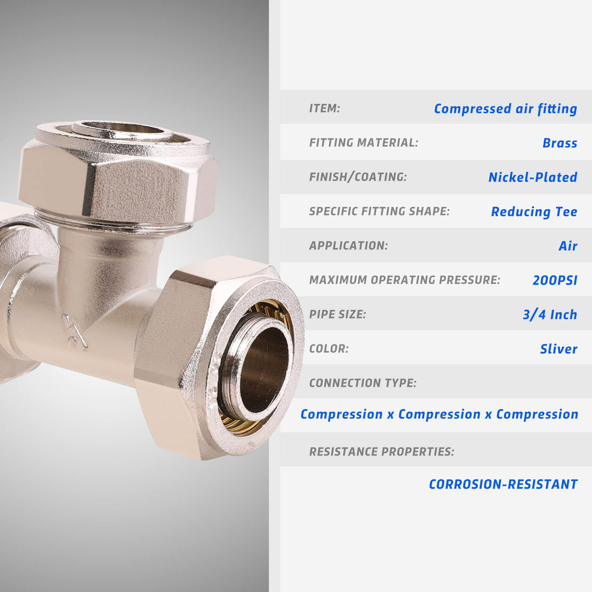 Ancimoon 2Pcs 3/4 Tee Air Piping Fittings, 3/4 Tubing X 3/4 Tubing X 3/4 Tubing, Brass Nickel Plated, 200Psi Working Pressure, A