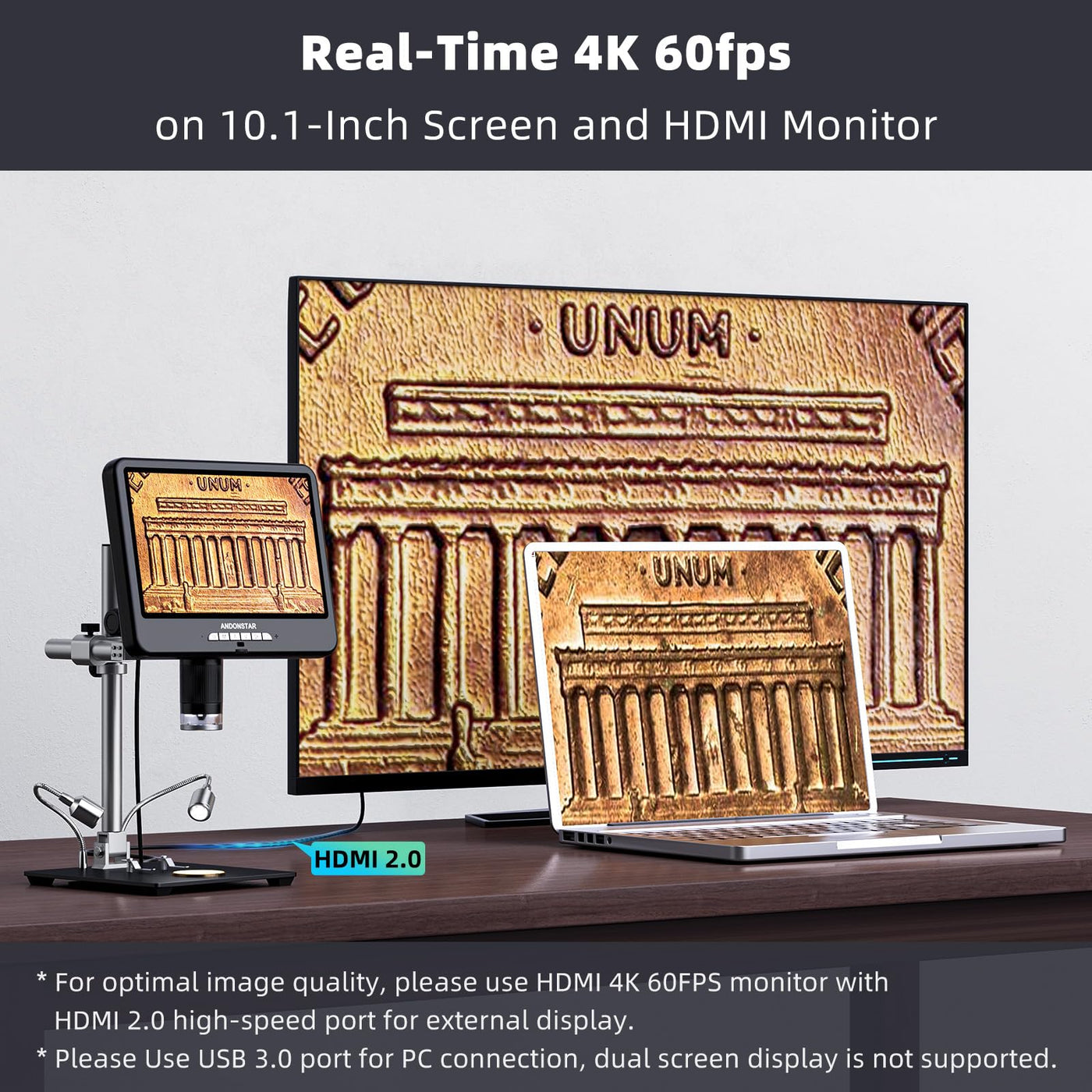 Q: What are the key features of the Andonstar 4K HDMI Digital Microscope?A: The Andonstar 4K HDMI Digital Microscope features ultra-clear 4K 60FPS output, integrated audio recording, a 10.1-inch screen, and a Pro Boom Arm Stand for added flexibility. It also includes adjustable LED lighting and multiple output options for seamless sharing and editing.