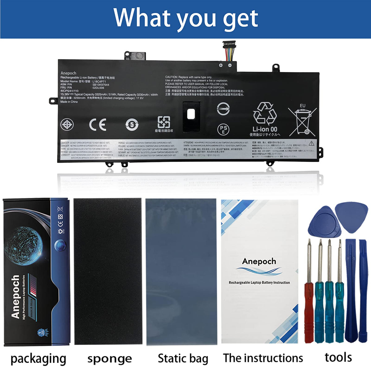 ? Battery Condition :Brand New; ? Battery Type :Li-Ion; ? Capacity :51Wh 3325Mah; ? Voltage :15.36V; ? Support: 24 X 7 Email Support, Rest Assured With 30 Days Refund,12 Months Replacement; ? Condition: 100% New From Manufacturer, Grade A Cell ? Replacement For Part Number: L18C4P71 02Dl006 Sb10K97644 02Dl004 L18L4P71 Sb10K97642 02Dl005 L18M4P72 Sb10K97643 5B10W13930 5B10W13931 5B10W13932 Sb10T83173 Sb10T83174. ? Compatible Models: Fit For Lenovo Thinkpad X1 Yoga 4Th Gen (X1 Yoga 2019 Gen) Series Fit For Lenovo Thinkpad X1 Yoga 5Th Gen (X1 Yoga 2020 Gen) Series Fit For Lenovo Thinkpad X1 Carbon 7Th Gen (X1 Carbon 2019 Gen) Series Fit For Lenovo Thinkpad X1 Carbon 8Th Gen (X1 Carbon 2020 Gen) Series ? Not All The Compatible Laptop Models Have Been Listed, Please Open The Back Case Of Your Laptop And Choose The Right Battery Model According To Your Laptop'S Origibal Batte. ? Note: 1.Before Placing Your Order, We Highly Suggest You To Open The Back Case Of Your Latptop And Check Out The Exact Part Number Of Your Laptop'S Original Battery. 2.Discharge The New Battery Use To 5%(Not To 0%) And Then Charge To 95%, And Cycle 3-4 Times. 3.Do Not Disassemble, Crush Or Puncture. Do Not Dispose Of In Fire Or Water. 4.If You Remove Battery For A Long Time, Charge More Than 80% At Least One Time Within One Months. 5.Don'T Connect Adapter For A Long Time While Using The Battery. It May Damage The Battery. 6.When Using The Battery, Care Should Be Taken To Prevent Exposure And Moisture.