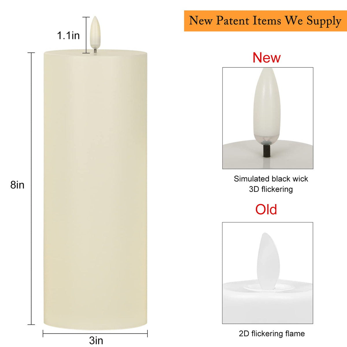 Q: What size are the ANGELLOONG flameless candles?A: The ANGELLOONG flameless candles come in a size of 3x8 inches, making them ideal for various decorative uses, including table centerpieces and outdoor displays.