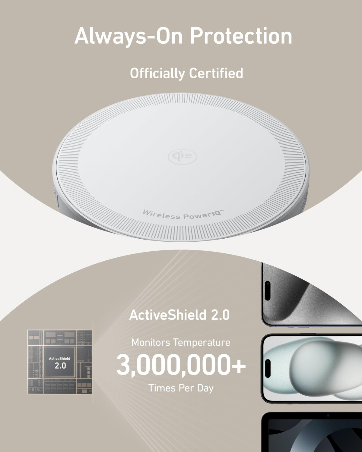 Q: What safety features does the Anker MagSafe Charger Pad include?A: The Anker MagSafe Charger Pad is equipped with the ActiveShield safety system, which monitors temperature and ensures reliable protection during charging. It also meets Qi2 certification standards for safe charging.