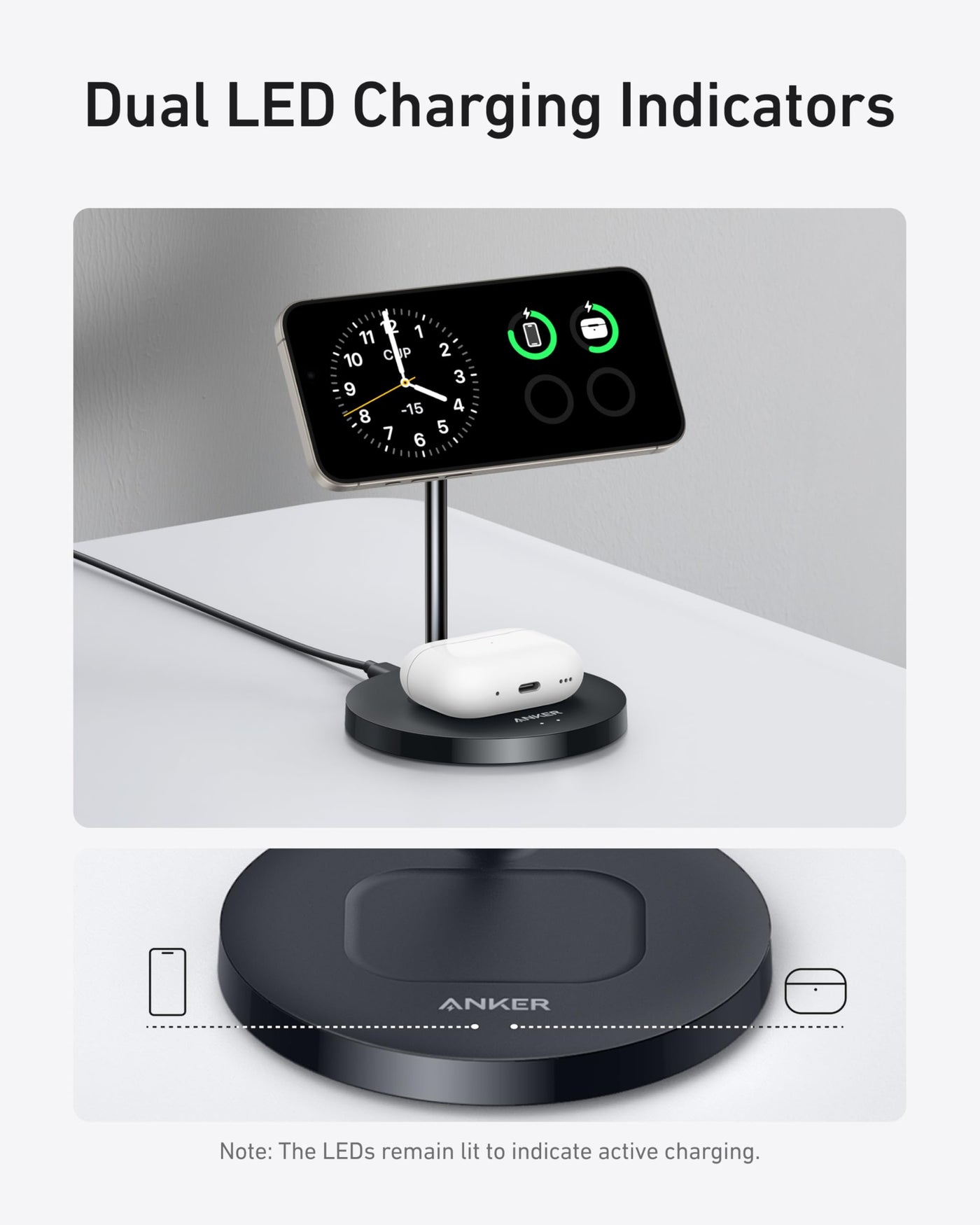 Q: Can I charge two devices simultaneously with this charger?A: Absolutely! The Anker MagGo Charger Stand allows you to charge both your iPhone and AirPods Pro at the same time, saving you time and improving convenience.