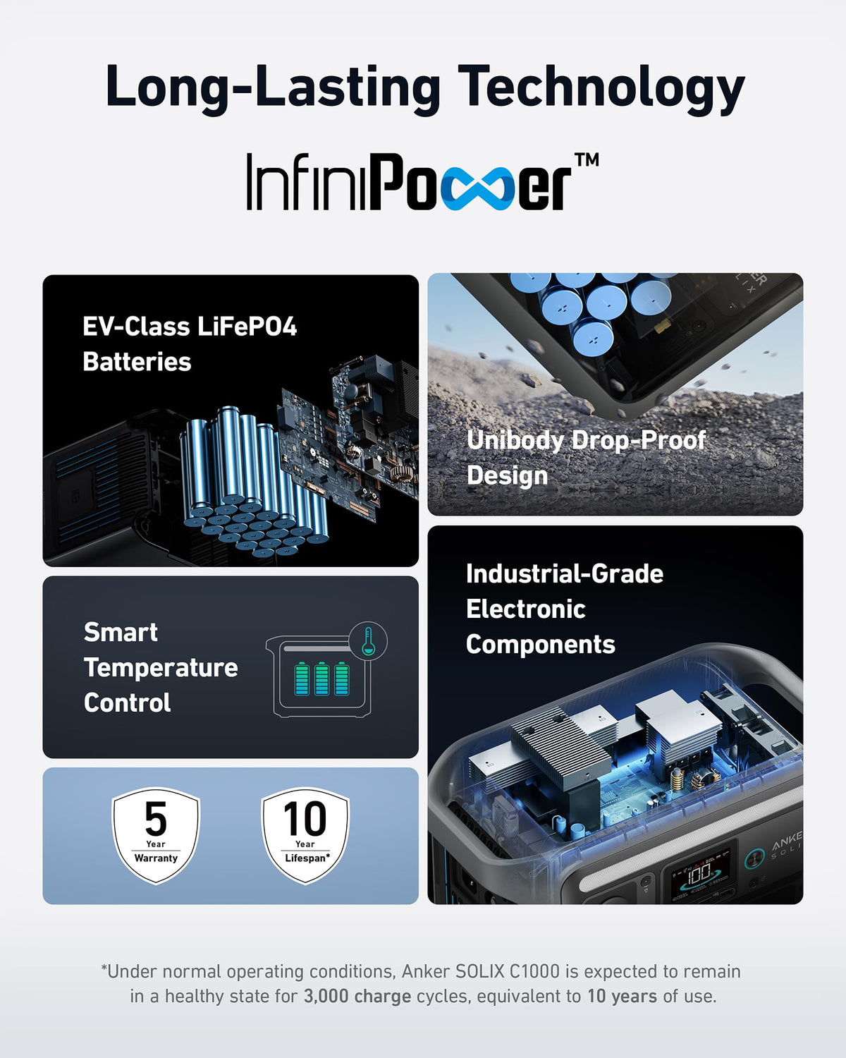 Q: What safety features does the Anker SOLIX C1000 have?A: The Anker SOLIX C1000 includes a 3-Point Safe Charging Clasp, ensuring a secure connection to the Anker SOLIX BP1000 Expansion Battery and protecting against charging issues.