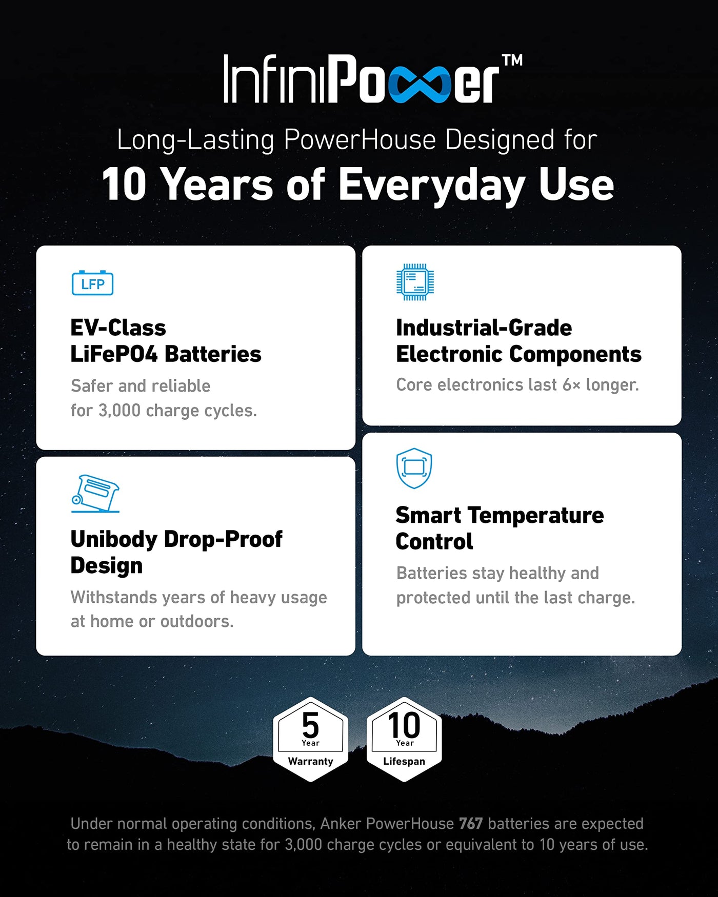 Q: What type of batteries does the Anker SOLIX F2000 use?A: The Anker SOLIX F2000 uses LiFePO4 batteries, which are known for their long lifespan and safety, ensuring reliable performance over a decade.