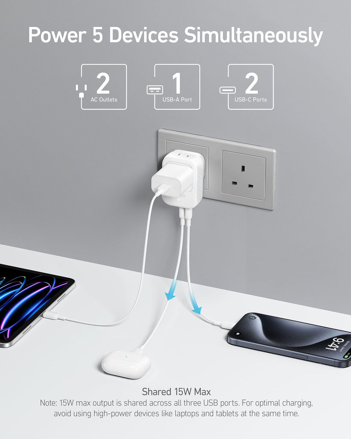 Q: Can I use this adapter for charging multiple devices at once?A: Yes, the Anker plug adapter is equipped with 2 AC ports, 2 USB-C ports, and 1 USB-A port, allowing you to charge multiple devices at the same time without sacrificing performance.