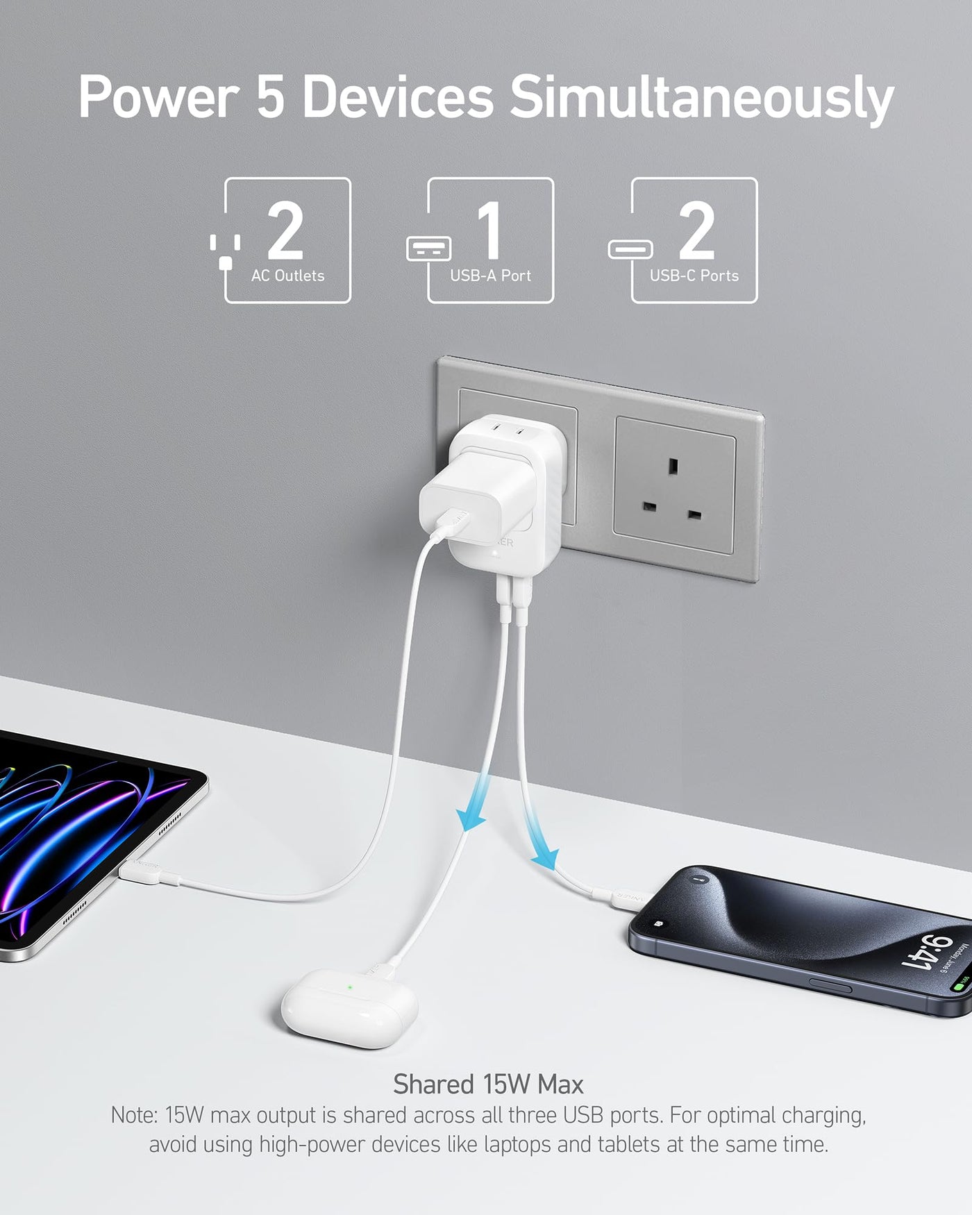 Anker Usa To Uk International Plug Adapter, Travel Adapter, 15W Max With 2 Ac, 2 Usb C, And 1 Usb A Port, Ideal For Iphone 15, I