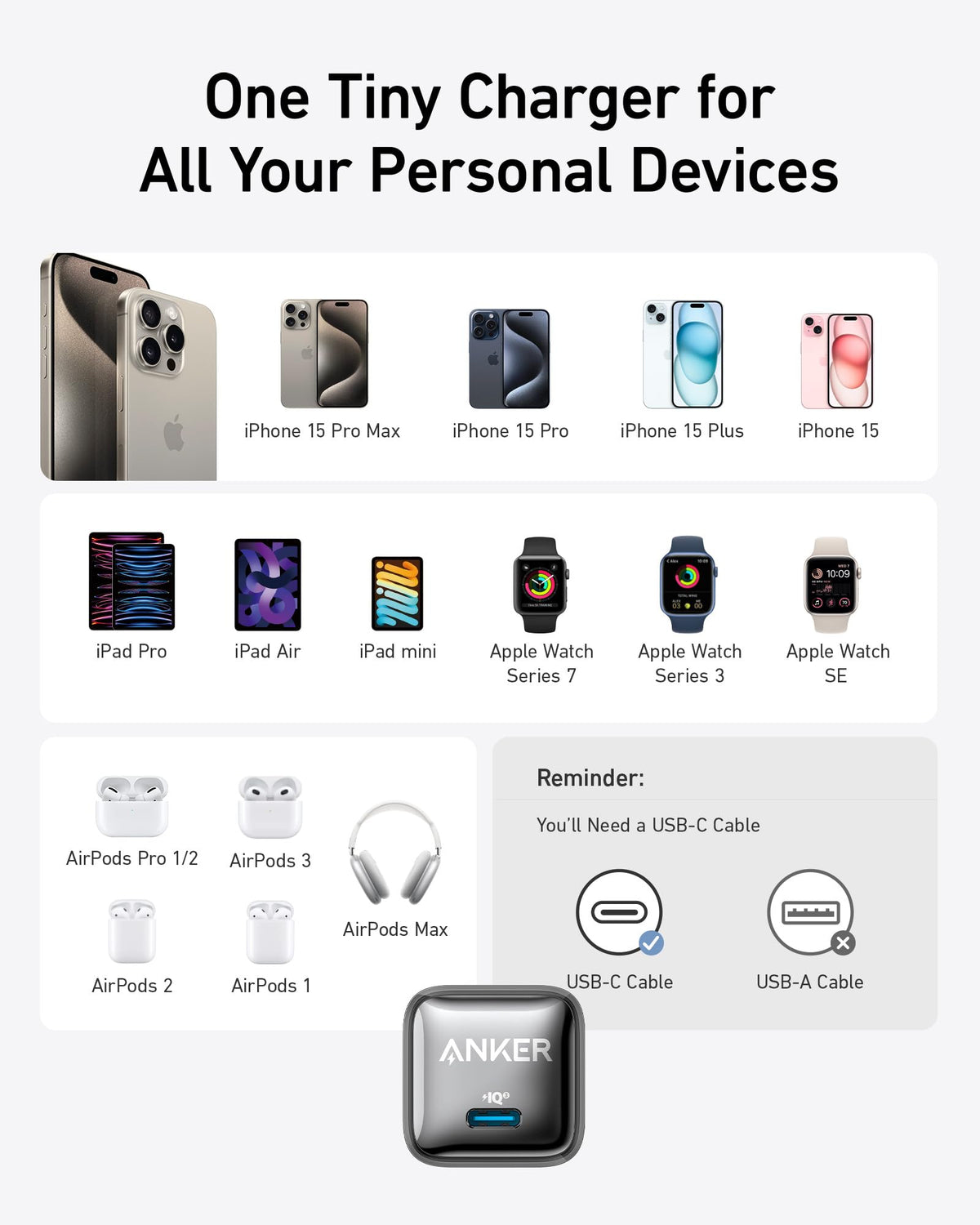 Anker Usb C Charger Block 20W, Anker 511 Charger (Nano Pro), Piq 3.0 Compact Fast Charger For Iphone 15/15 Plus/15 Pro/15 Pro Ma