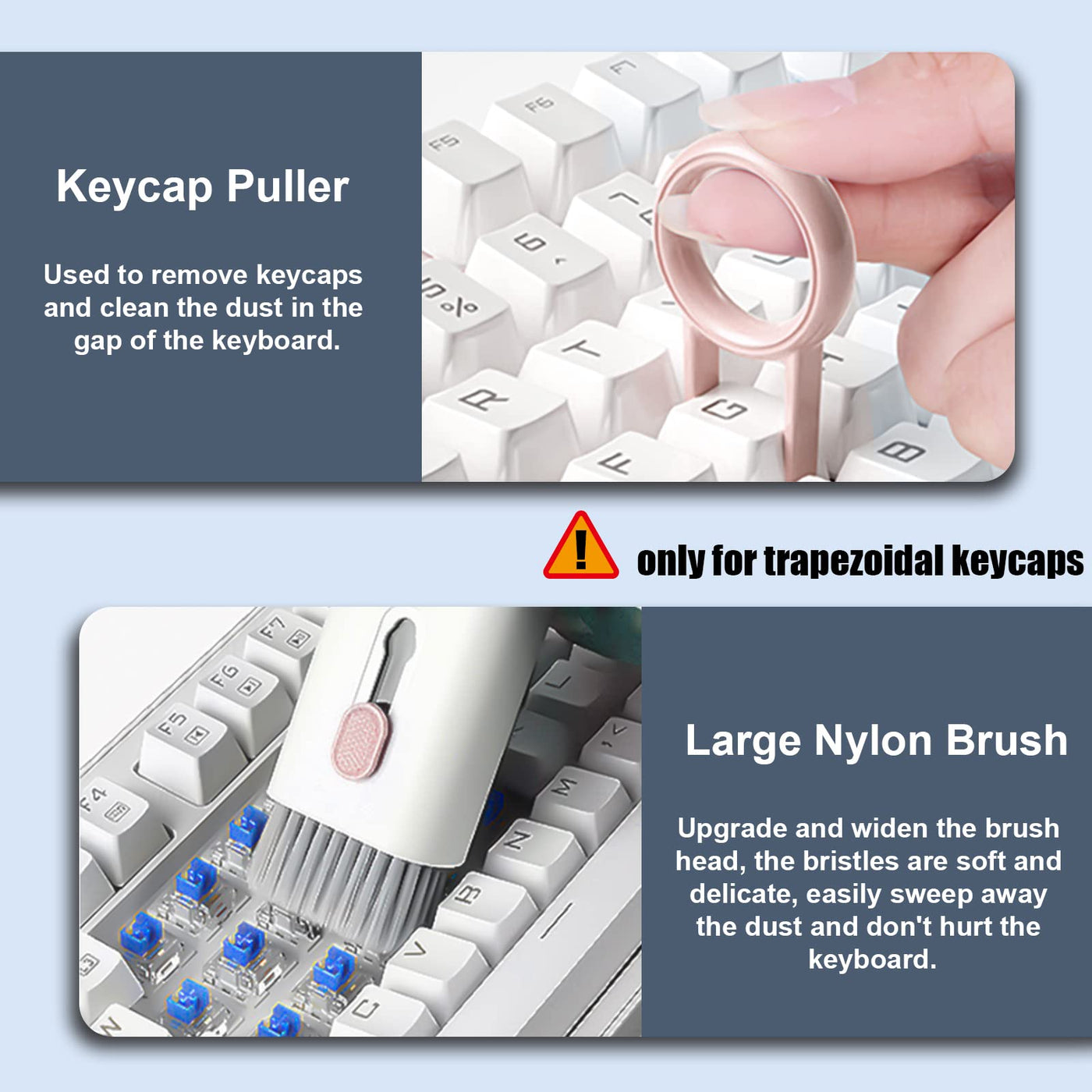 Q: How does the 7 in 1 multifunctional cleaner work?A: The 7 in 1 multifunctional cleaner includes a cleaning pen with a silicone tip, a mini brush, a large soft fiber keyboard brush, a keycap puller, and a spray bottle. This combination allows you to effectively clean different surfaces and components such as screens, keyboards, and earphones.