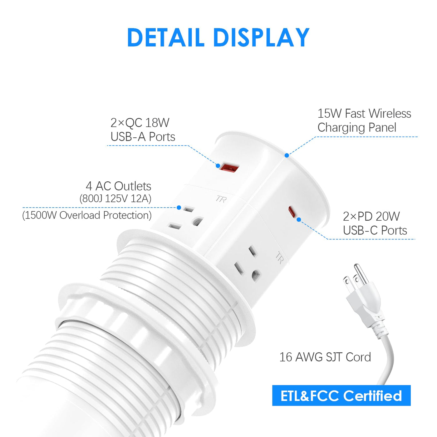 Annquan 3.15'' Pop Up Countertop Outlet With 15W Wireless Charger,Max 20W Power Delivery,800J Surge Protection,Pop Up Socket Wit