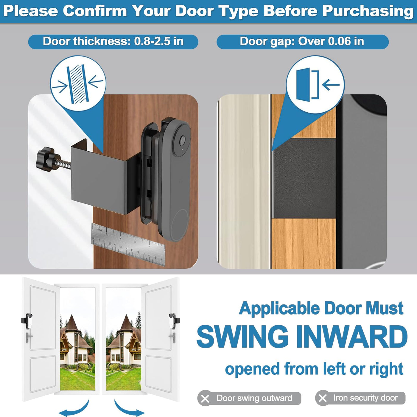 Q: Can this mount be used on any type of door?A: This mount is suitable for inward-opening doors with a thickness of 0.8 in - 2.5 in and a gap greater than 0.08 in between the door and frame. It is not suitable for outward-opening doors or iron security doors.