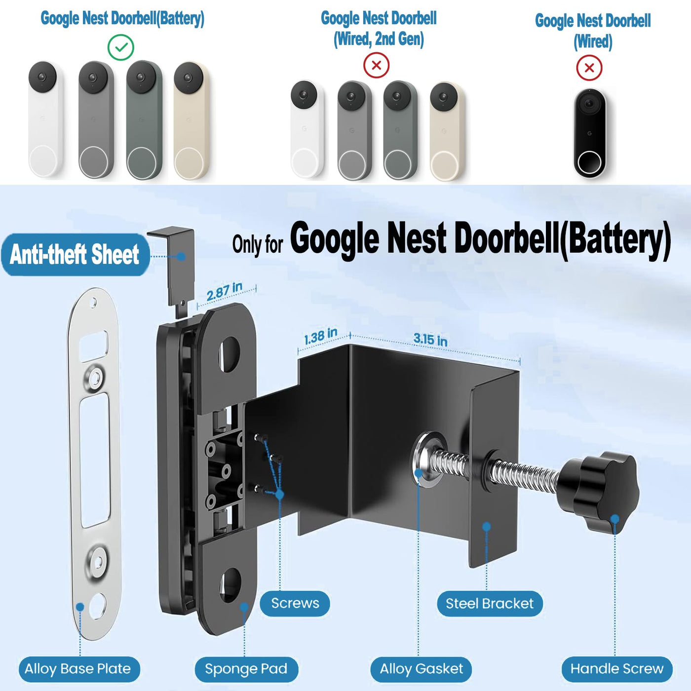 Q: Is this mount compatible with the Google Nest Doorbell?A: Yes, this Anti-Theft Adjustable Mount is specifically designed for the Google Nest Doorbell (Battery), ensuring a secure fit and optimal performance.