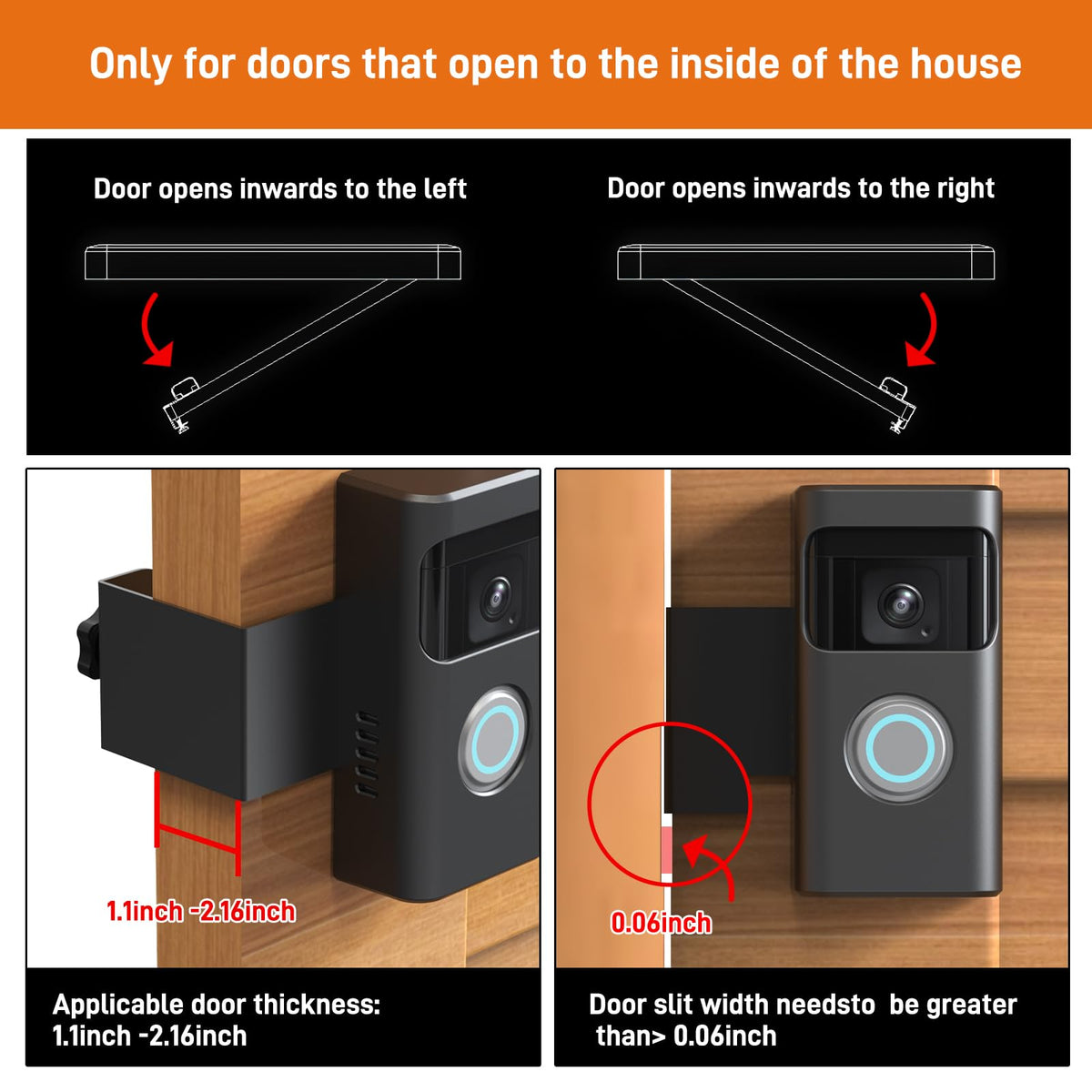 Q: What is the maximum door thickness for the mount to fit?A: The Anti-Theft Ring Doorbell Mount is designed to fit doors with a thickness between 1.1 inches and 2.16 inches. Ensure that the door slit width is greater than 0.06 inches for proper installation.