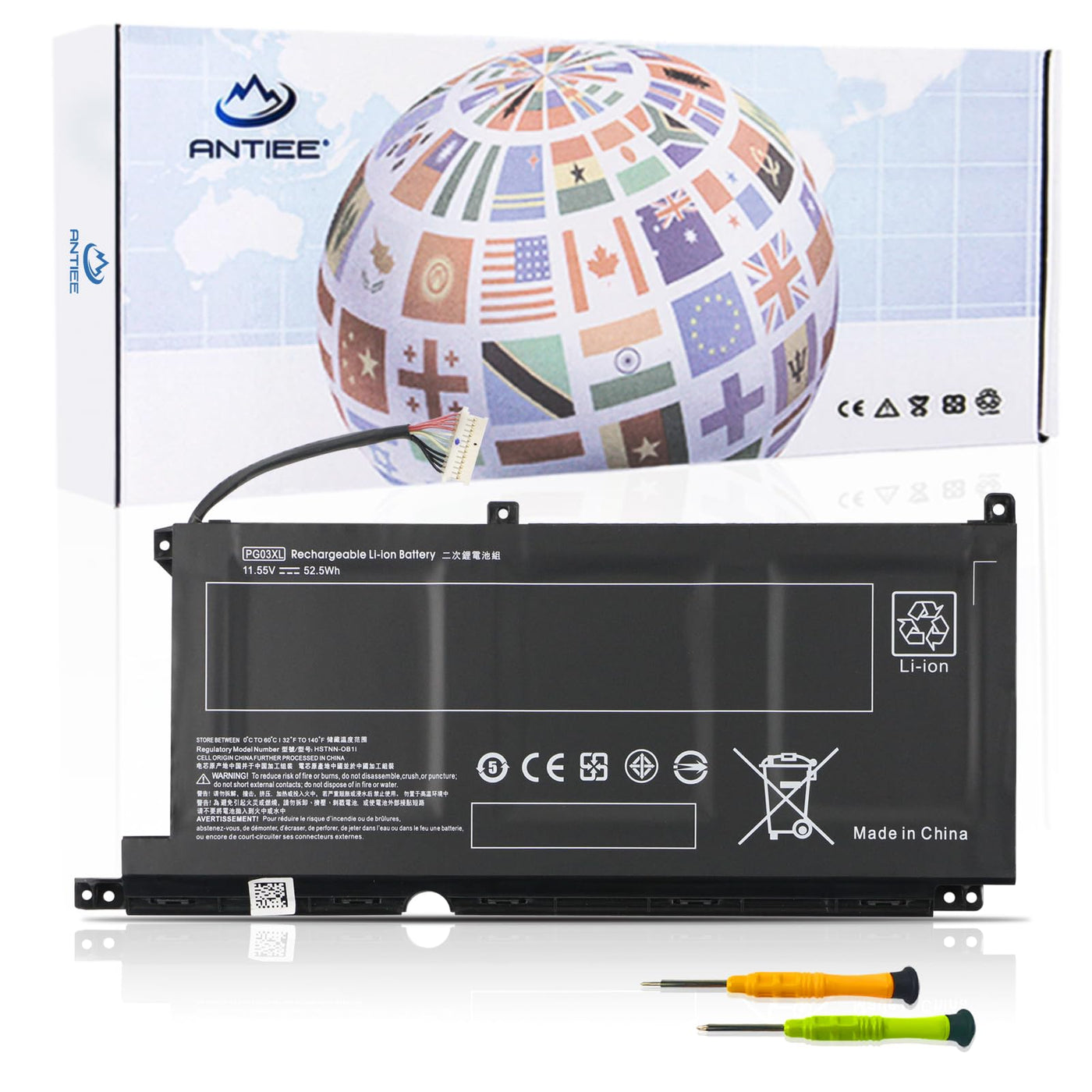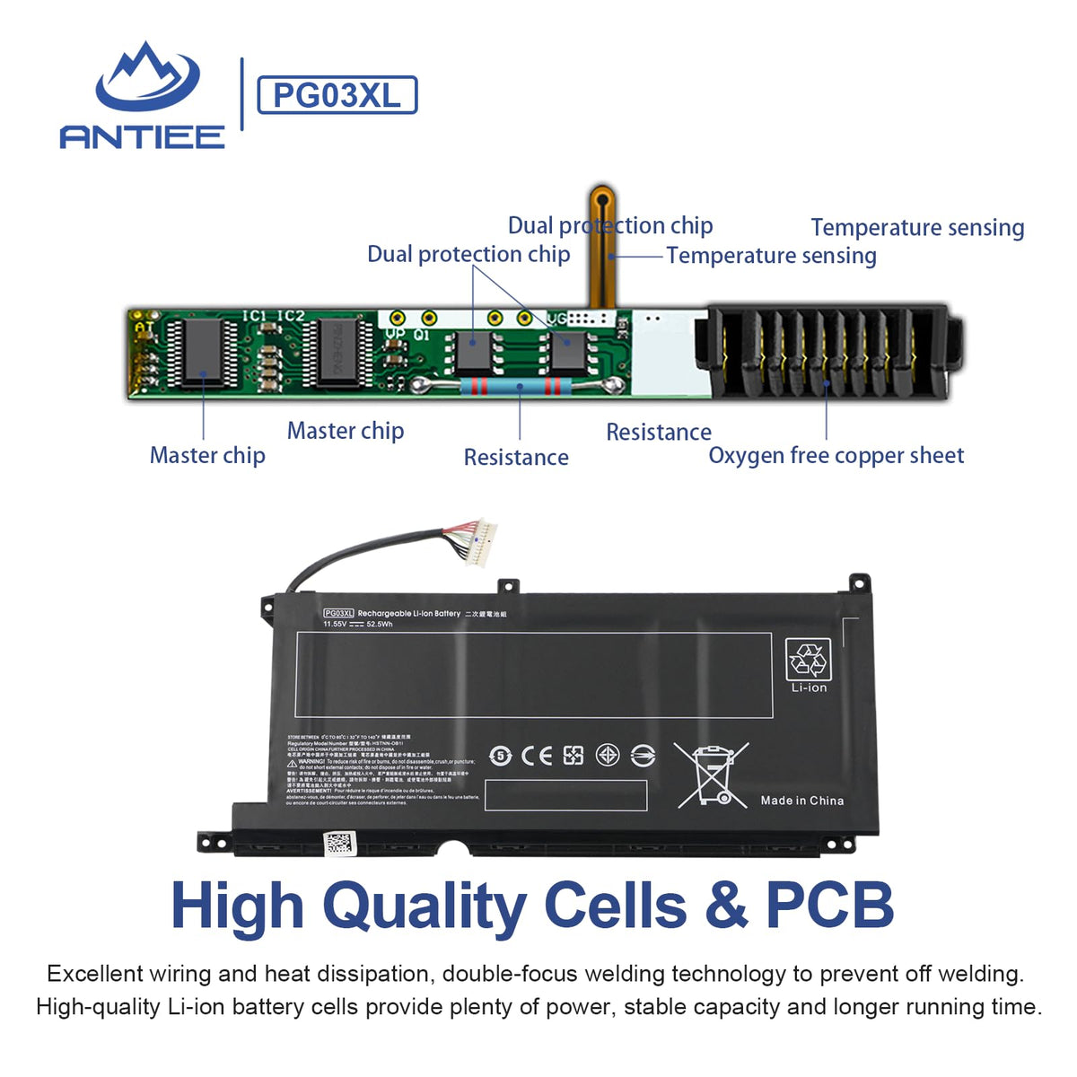 Q: What is the voltage and capacity of the ANTIEE PG03XL Laptop Battery?A: The ANTIEE PG03XL Laptop Battery operates at a voltage of 11.55V and has a capacity of 52.5Wh, making it a reliable power source for your HP Pavilion Gaming laptop.