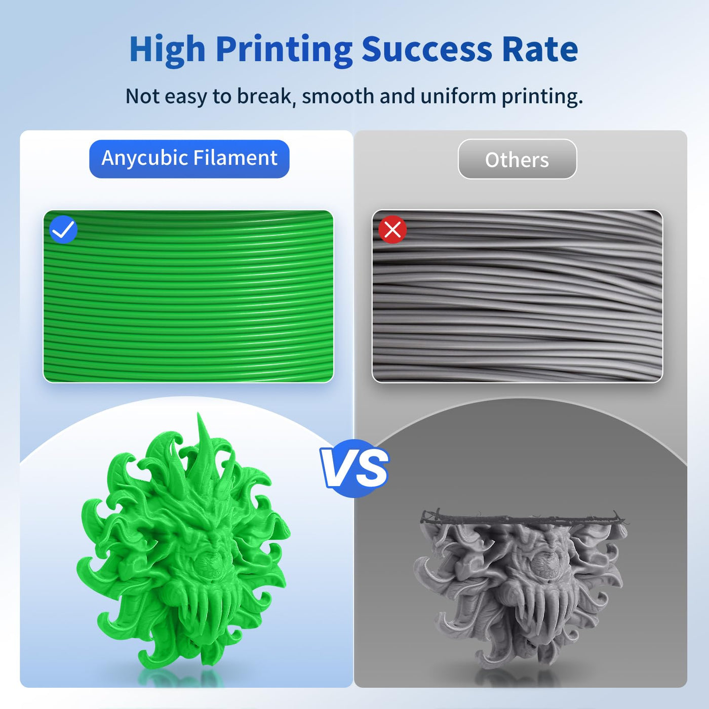 Q: What are the benefits of using ANYCUBIC PLA filament for 3D printing projects?A: Using ANYCUBIC PLA filament provides several benefits, including minimal warping, high gloss finish, and reduced stringing in prints. The filament's low shrinkage and consistent dimensions contribute to excellent layer fusion, resulting in high-quality prints for various 3D printing projects.