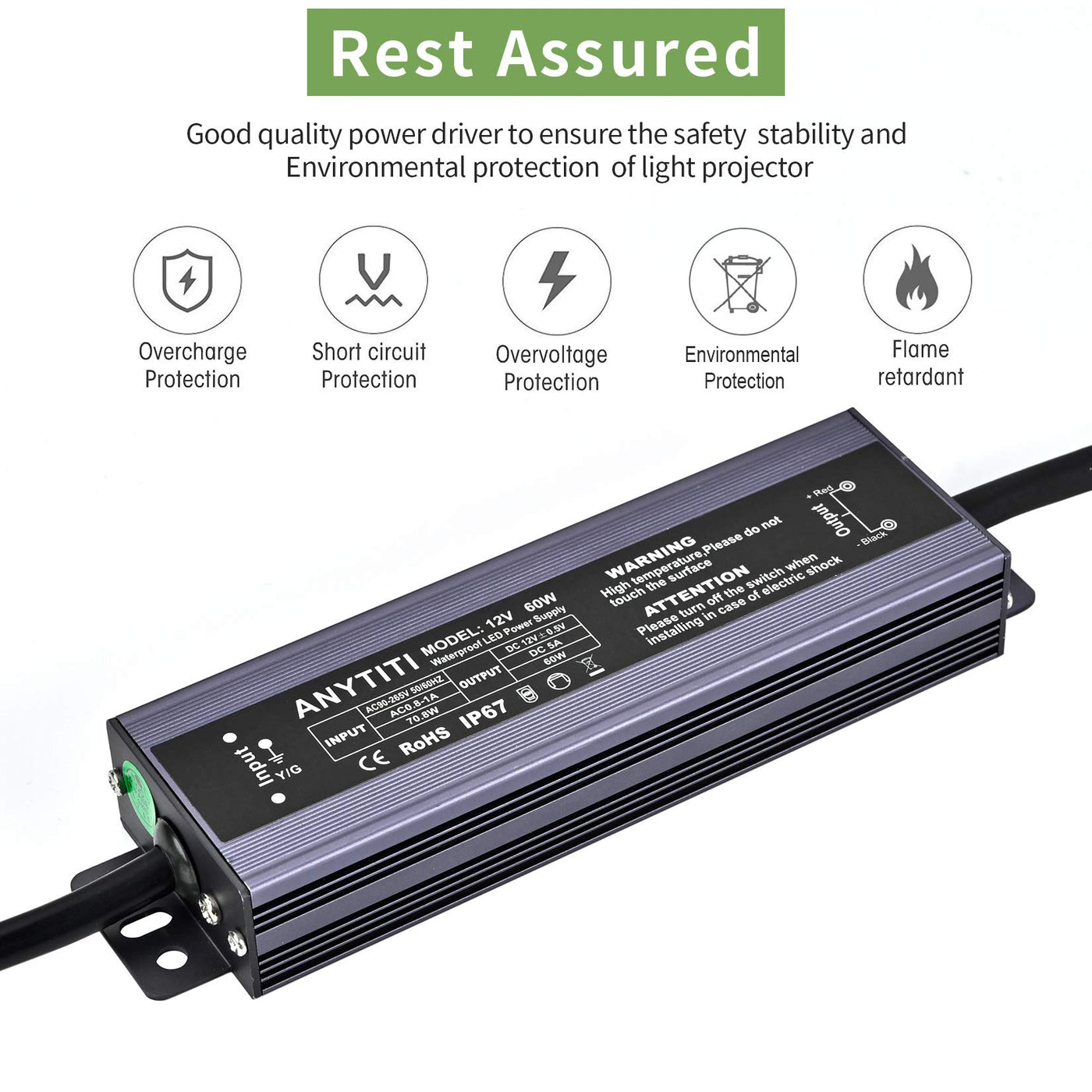 Waterproof Ip67 Led Driver,Switching Power Supply,Led Transformers,Power Supply Converter Adapter For Outdoor Use,12V,5A Max,60Watts Features: Constant Voltage Style Power Supply Universal Ac Inputfull Range Cooling By Free Air Convection Fully Encapsulated With Ip67 Level 100% Full Load Burn-In Test Small Volume, Low Weight And High Efficiency Protections For Short Circuit, Over Load, Over Voltage And Over Temperature Product Specifications: Input: 90-265V Ac 47-63Hz Output: 12V Dc 5A Wattage: 60W Working Temperature: -20 To +60 Working Relative Humidity:20%-90%Rh Dimensions:752*374*193 Inches Waterproof:Ip67 Weight:089 Pounds Warnings: Dont Open Or Modify The Led Power Supply Please Leave Children, Kids Far Away From High Voltage Power Source Please Use It Under Professional Electricians Guides Package List:1 * 60W Waterproof Led Power Supply