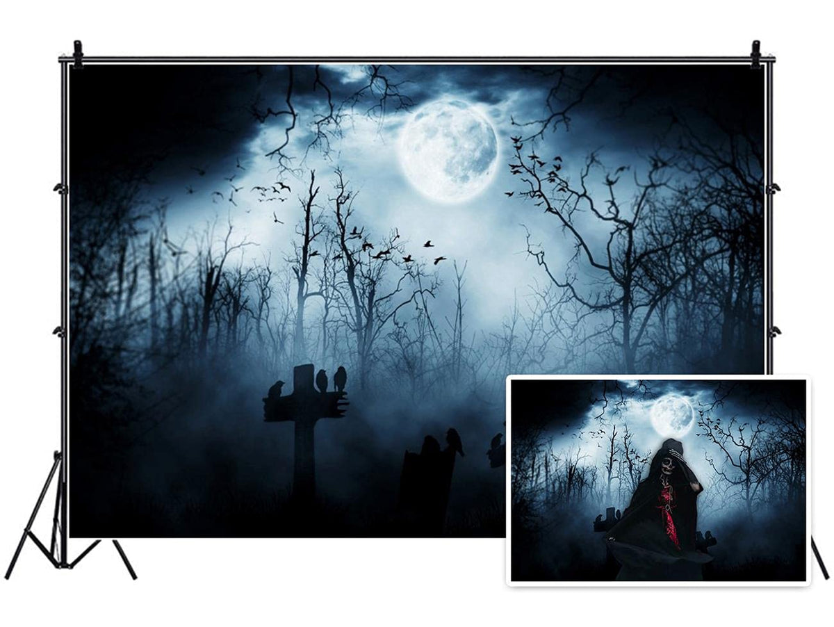 Aofoto 7X5Ft Moon Night Halloween Cemetery Photography Backdrop Flying Bats Birds Stand On Gravestone Cross Graveyard In Dark Fo