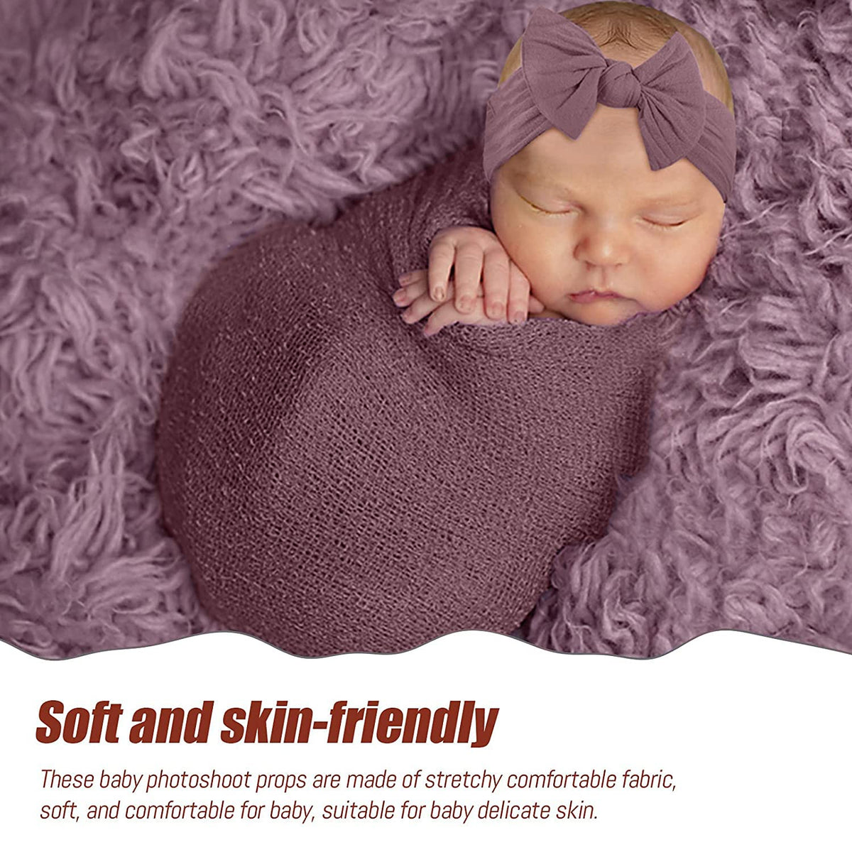 Q: What is included in the 5 PCS newborn photography props set?A: The set includes two wraps (90x170 cm), one blanket (60x70 cm), and two beautiful headbands that can stretch to fit growing babies, making it suitable for ages 1 month to 12 months.