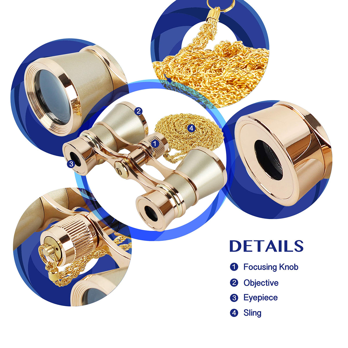 Features: Stylish And Modern Opera Glasses Magnification: 3X Objective Lens Diameter (Aperture): 25Mm Interpupillary Distance (Ipd): 58-70Mm Focus Mode: Central Focusing Net Weight: 0.38Lb(Approx.) Package Weight:0.46Lb(Approx) Package Included: 1 X Binocular, 1 X Cleaning Cloth, 1 X Soft Pounch