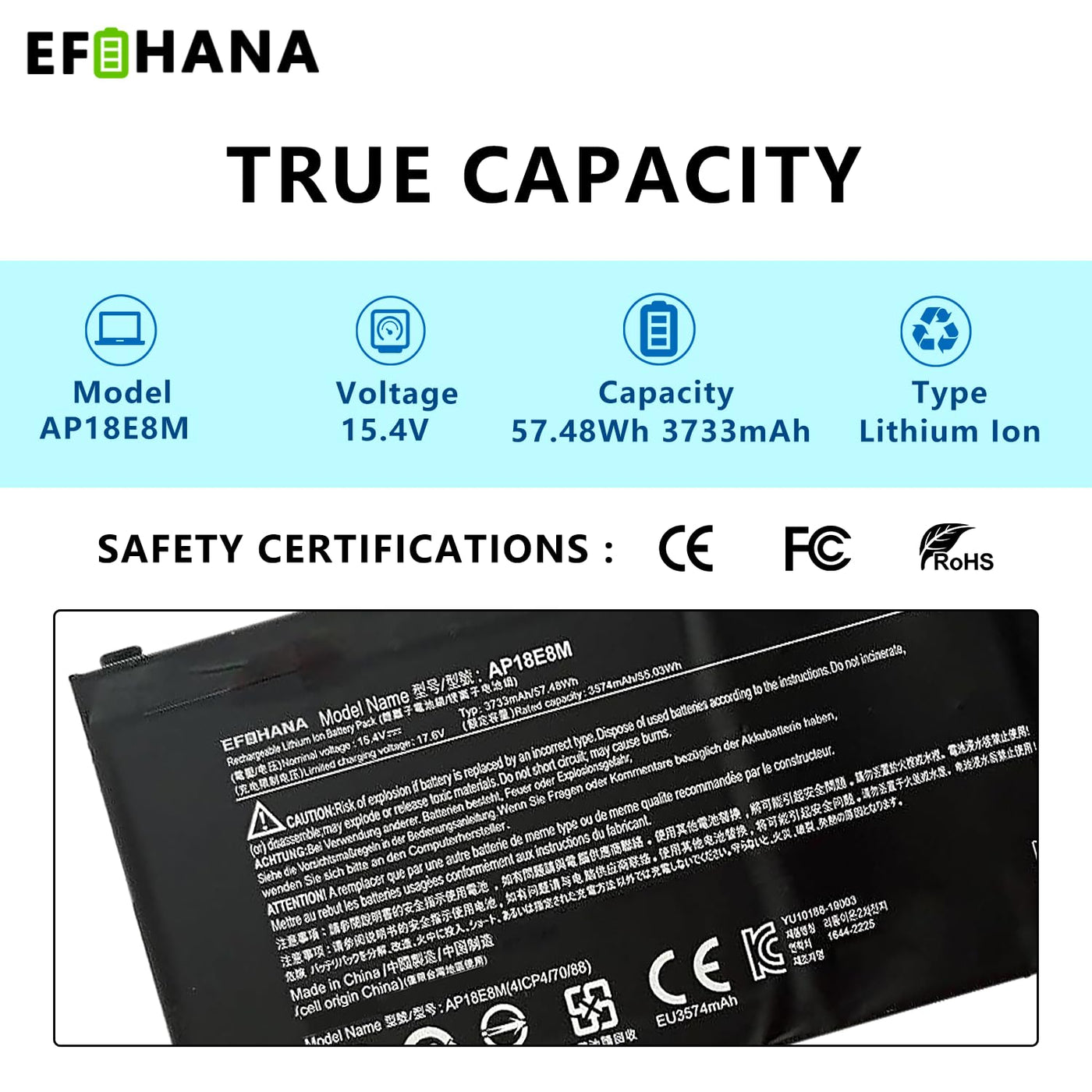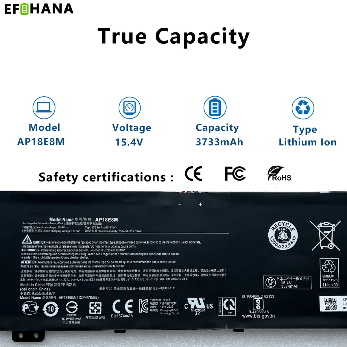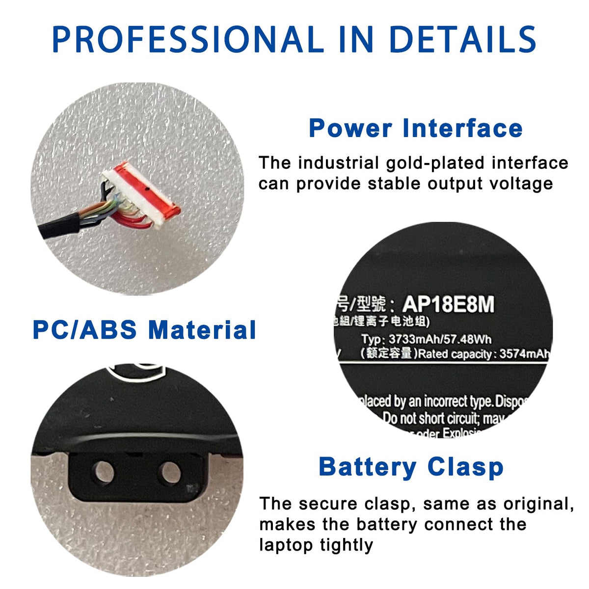 Q: What is the capacity and voltage of the AP18E8M battery?A: The AP18E8M battery has a capacity of 57.47Wh (3733mAh) and operates at a voltage of 15.4V, ensuring efficient power supply for your laptop.