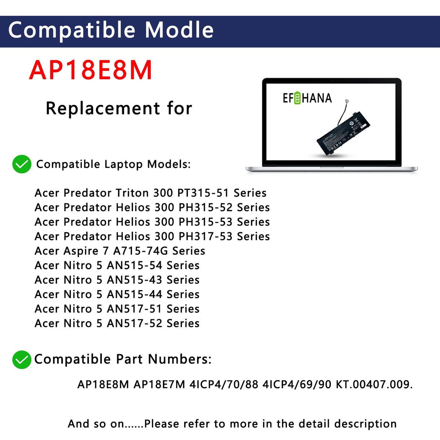 Specification: Type:Ap18E7M Voltage:154V Capacity:5875Wh 3815Mah Battery Condition:Brand New Compatible Part Numbers: Ap18E7M Ap18E8M 4Icp46990 Compatible Machine Models: Acer Nitro 5 An515-54 Series Acer Nitro 5 An517-51 Series Acer Nitro 7 An715-51 Series Acer Aspire 7 A715-74G A715-74G-50U5 Series Acer Predator Helios 300 Ph315-52 Ph317-53 Series Acer Predator Triton 300 Pt315-51 Series