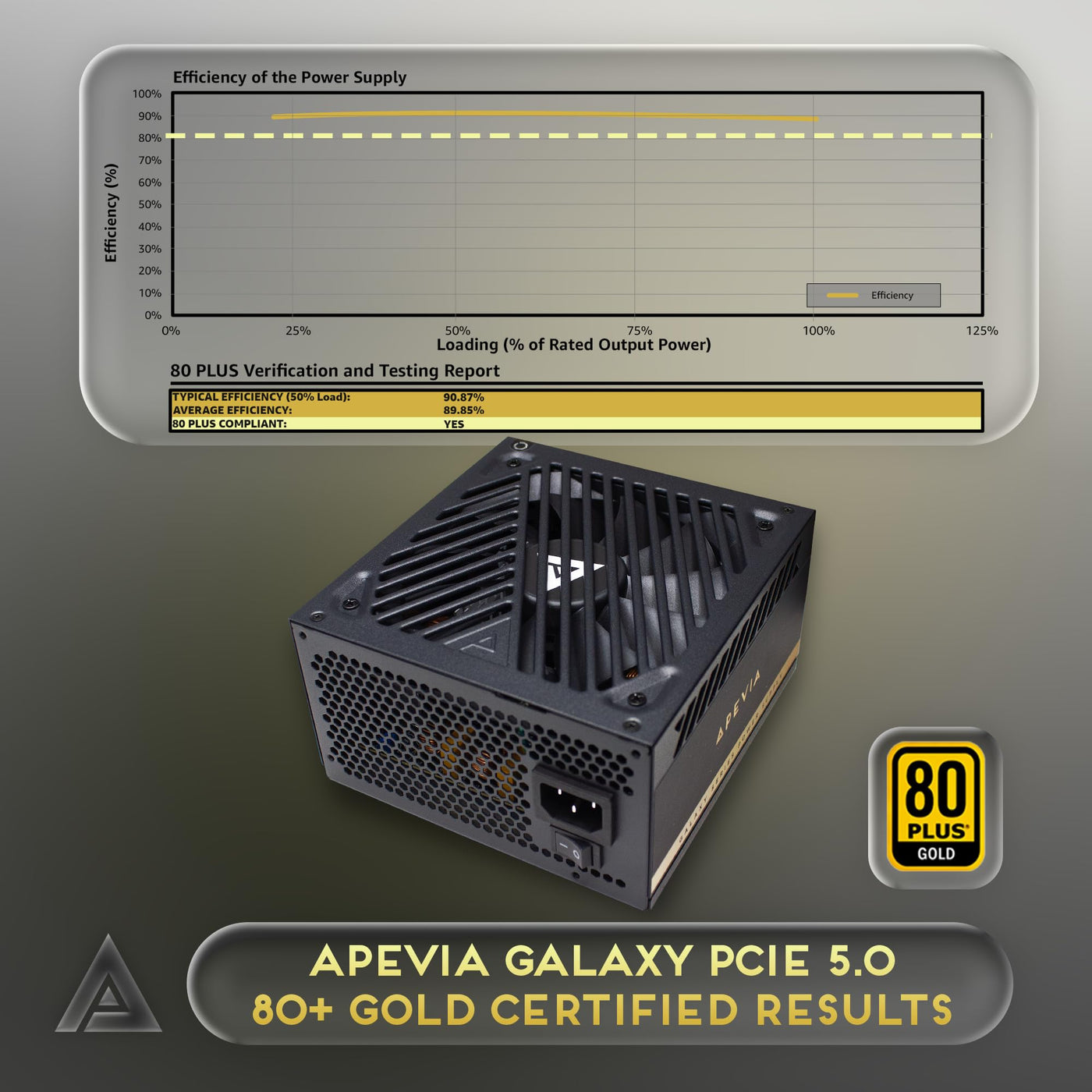 Apevia Atx-Gx850W Pcie 5.0 Version Galaxy 850W With Pcle 5.0 / Gen 5 12Vhpwr 12+4 (12Pin/16Pin) Psu Connector, 80 Plus Gold Certified & Rohs Compliance, Active Pfc Atx Gaming Power Supply. | Supports Dual /Quad/Multi-Core Cpus. Supports Single 12V Output For Higher Power Usage. Ample +12 V Output, Enhanced +12 V Current Capability Broadens Utilization Possibilities. | Dc To Dc Converter Design, Provides Superior Dynamic Response, Greater Sytem Stability And Maximizes The 12V Dc Rail Output. Multi-Gpu Technologies Supported; 6 Pin And 8 Pin Pci-E Connectors, Pcle 5.0 / Gen 5 12Vhpwr Psu Connector, Support All Gpu Platforms. Built In 1 X Auto-Thermally Controlled Black 135Mm Fan | Heavy-Duty Protections, Including Ovp (Over Voltage Protection), Opp (Over Powerprotection), Scp (Shart Circuit Protection). Includes The Pcle 5.0 / Gen 5 12Vhpwr 12+4 (12Pin/16Pin) Psu Connector To Deliver Power To The Most Advanced Pcie 5.0 High End Graphics Cards. | Connectors:1 X 20/24Pin Main Power, 2 X 4/8Pin 12V, 1 X Pcie 5.0 / Gen 5 12Vhpwr 12+4Pin (12Pin/16Pin), 4 X Pci 6+2Pin, 7 X Sata, 4 X Peripheral