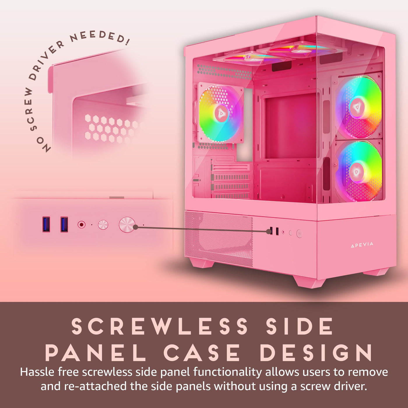 The Apevia Phantom Micro-Atx Dual-Chamber Pc Case Series Allows Gamers To Maximize Their Gaming Limits, Showcasing A Dual-Chamber Case Design, High Quality Features, And Exceptional Performance. Its Dual Tempered Glass Panels Showcase Five Illuminating 120Mm Argb Fans, Ensuring Exceptional Airflow - Two Positioned On The Top, Two On The Side Panel With Ventilated Holes, And One At The Rear. These Fans Radiate A Gleaming Glow With Inner Led Rings, And They Seamlessly Synchronize With Argb Software Through A 3Pin Argb Connector When Paired With Compatible Motherboards. Even Without Such Motherboard Compatibility, Gamers Can Choose Between A Staggering 366 Rgb Color Modes. Managing The Rgb Lighting Is Effortless Thanks To A User-Friendly Led Button On The Top Panel. Hold The Led Button For 5 Seconds, And You Can Seamlessly Switch Between The 366 Rgb Modes And Argb Motherboard Sync. The I/O Panel On The Side Offers Convenient Connections, Including 2X Usb 3.0 Ports, A Power Button, An Led Switch Button, And Hd Audio Jack For External Audio Devices. With Support For 240Mm Radiators On The Top Panel, Gamers Have The Option To Easily Install Sizable Water Cooling Aios, Elevating The Visual Appeal Of Their Setup. The Apevia Phantom'S Matching Paint Colors On Both The Exterior And Interior Define Its Premium Appearance. Facilitating Gpu Installation, The Case Supports Graphics Cards Up To 350Mm In Length. The Apevia Phantom Is Available In Black, White, And Pink Color Variants, Allowing Gamers To Choose The Perfect Color Setup For Their Style.