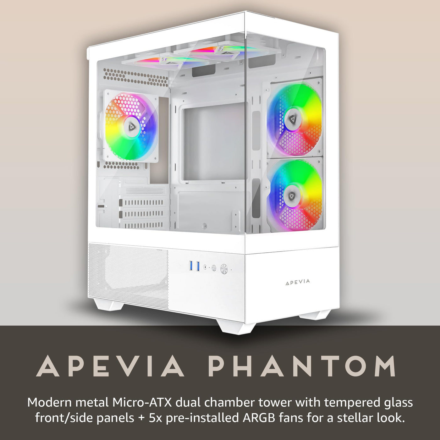 Apevia Phantom Wh Phantom Micro Atx Dual Chamber Gaming Pc Case W/ 5X 120Mm Argb Fans, 366 Rgb Modes, Dual Tempered Glass Panels