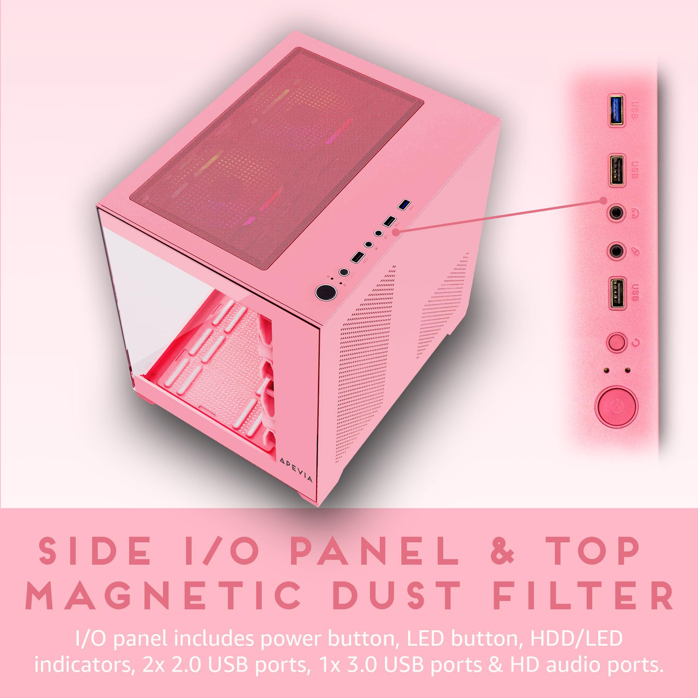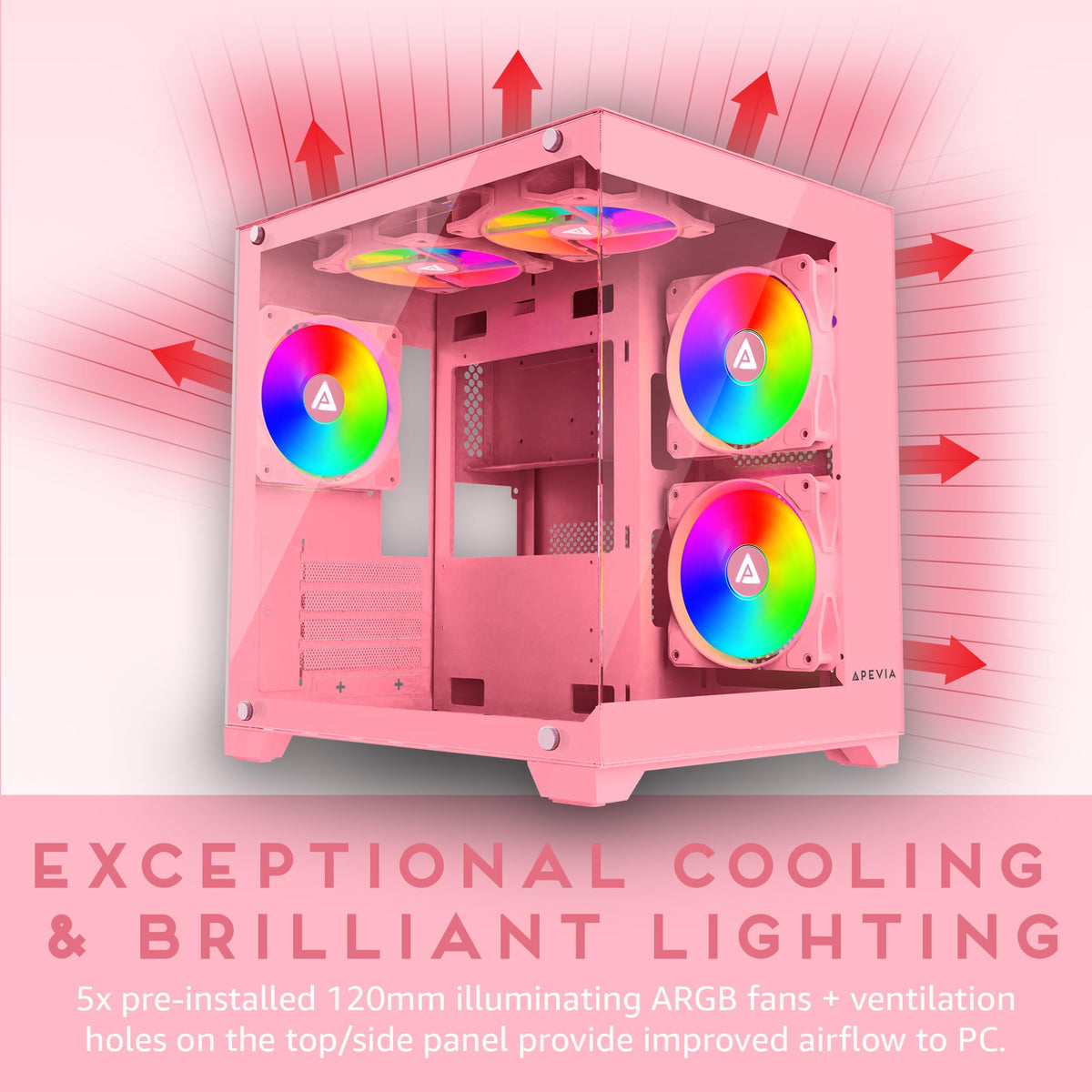 The Apevia Prism Micro-Atx Pc Case Series Allows Gamers To Amplify Their Gaming Proficiency, Boasting A Unique Case Design, Premium Features, And Top-Notch Performance. Its Dual Tempered Glass Panels Proudly Showcase Five Dazzling 120Mm Argb Fans, Ensuring Exceptional Airflow - Two Positioned On The Top, Three On The Side, And One At The Rear. These Fans Emit A Radiant Glow With Both Inner And Outer Rgb Rings, And They Seamlessly Synchronize With Argb Software Through A 3Pin Argb Connector When Paired With Compatible Motherboards. Even Without Such Motherboard Compatibility, Gamers Can Relish In A Staggering 366 Rgb Color Modes. Managing The Rgb Lighting Is Effortless Thanks To A User-Friendly Led Button On The Top Panel. Hold The Led Button For 5 Seconds, And You Can Seamlessly Switch Between The 366 Rgb Modes And Argb Motherboard Sync. The Top Panel Offers Convenient Connections, Including 1X Usb 3.0 Port, 2X Usb 2.0 Ports, A Power Button, An Led Switch Button, Hdd / Power Led Indicators, And Hd Audio Jack For External Audio Devices. With Support For 240Mm Radiators, Gamers Have The Option To Easily Install Sizable Water Cooling Aios, Elevating The Visual Appeal Of Their Setup. The Apevia Prism Harmonious Paint Colors, Both On The Exterior And Interior Define Its Premium Appearance. Facilitating Gpu Installation, The Case Supports Graphics Cards Up To 340Mm, Made Even Simpler With Removable And Reusable Screw-In Pci-E Covers. The Apevia Prism Is Available In Black, White, And Pink Color Variants, Allowing Gamers To Choose The Perfect Fit For Their Style.