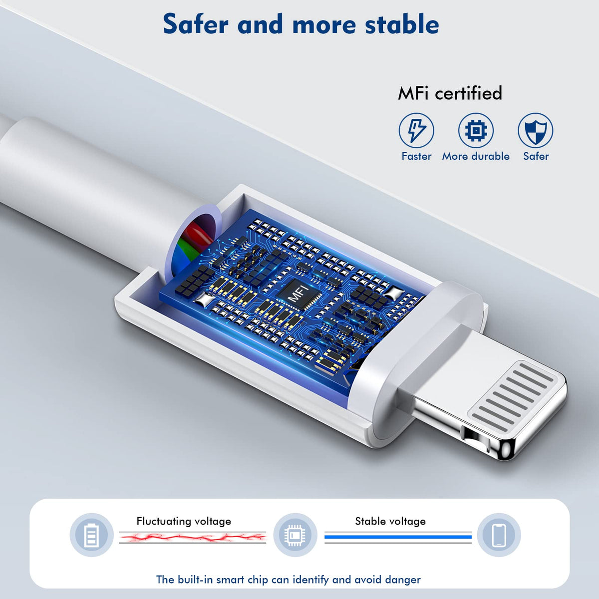 Q: What makes this charger safe for my iPhone?A: This charger includes a built-in smart chip that protects your device's battery from overheating and over-voltage during charging, ensuring safety and stability while using the charger.