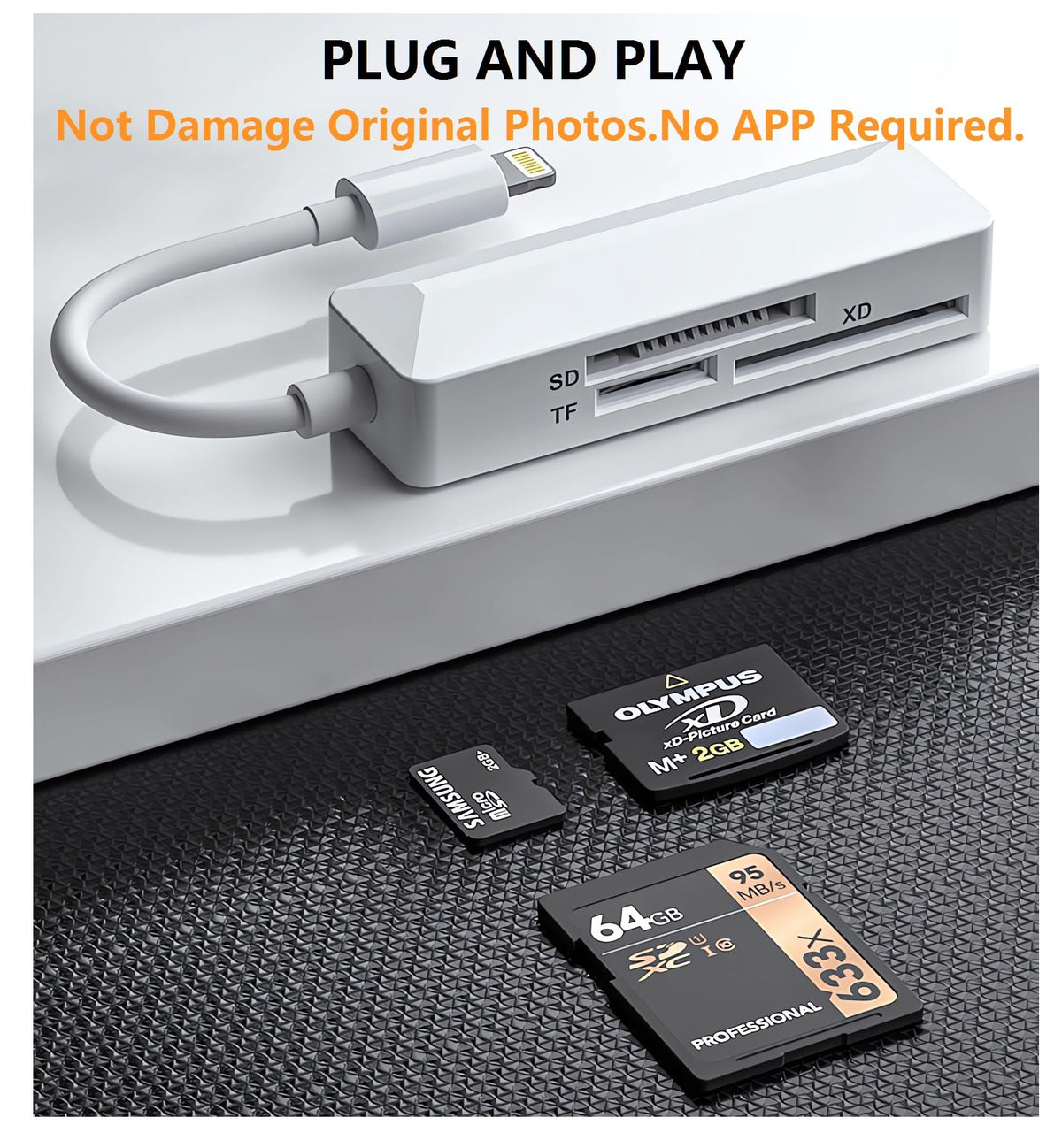 Iphone Sd Card Reader,Lightning To Sd Card Reader For Iphone Ipad Compatible With Iphone 14 13 12 11 Xs Xr X 8 7 6 Plus,Two-Way Transfer Memory Card Adapter 3 In 1 Mutil-Function Compatible With Sd/Tf/Xd Card, Memory Card Reader Portable Adapter Two-Way Transfer: From Sd Card To Iphone Or Iphone To Sd Memory Card, The Sd Card Reader For Iphone Is Compatible With Sd, Sdhc, Sdxc, Microsd, Microsdxc And Microsdhc Memory Cards. Allow You To Copy Files To Your Iphone More Easily. A Versatile And Efficient Lightning To 3-In-1 Sd Card Adapter. This Essential Tool Allows You To Connect Your Ios Device To A Variety Of Peripherals, Making It A Must-Have For Anyone Who Wants To Maximize Their Efficiency At Work Or Play. With A High-Speed Data Carrying Capacity Of 14Mb/S~16Mb/S, Your Files Will Transfer Swiftly At High Speed. The Sd/Tf Card Reader Supports Memory Card Capacity Less Than 512Gb (Including 512Gb), Allowing You To Easily Copy Photos And Videos To Your Camera In A Short Amount Of Time. The Sd Carf Reader Is Not Just A Card Reader, It'S A Versatile Tool That Can Read U Disk Files From Your Iphone/Ipad, Allowing You To Watch Movies On Your Device And Solving Your Problem Of Insufficient Memory. With This Mutilfunctional Card Reader Adapter For Iphone, Making It An Ideal Choice For Both Personal And Professional Use. ?Applicable Equipment? For Iphone 5, 5C, 5S, Se,6 6S,6 Plus For Iphone 7/7 Plus/8/8 Plus For Iphone Se,X,Xr,Xs,Xs Max For Iphone 11,11 Pro,11 Pro Max For Iphone 12,12 Pro Max,Iphone 12 Mini For Iphone 13,13 Pro Max,14 Pro Compatible With Sd, Sdhc, Sdxc, Microsd, Microsdxc And Microsdhc Memory Cards